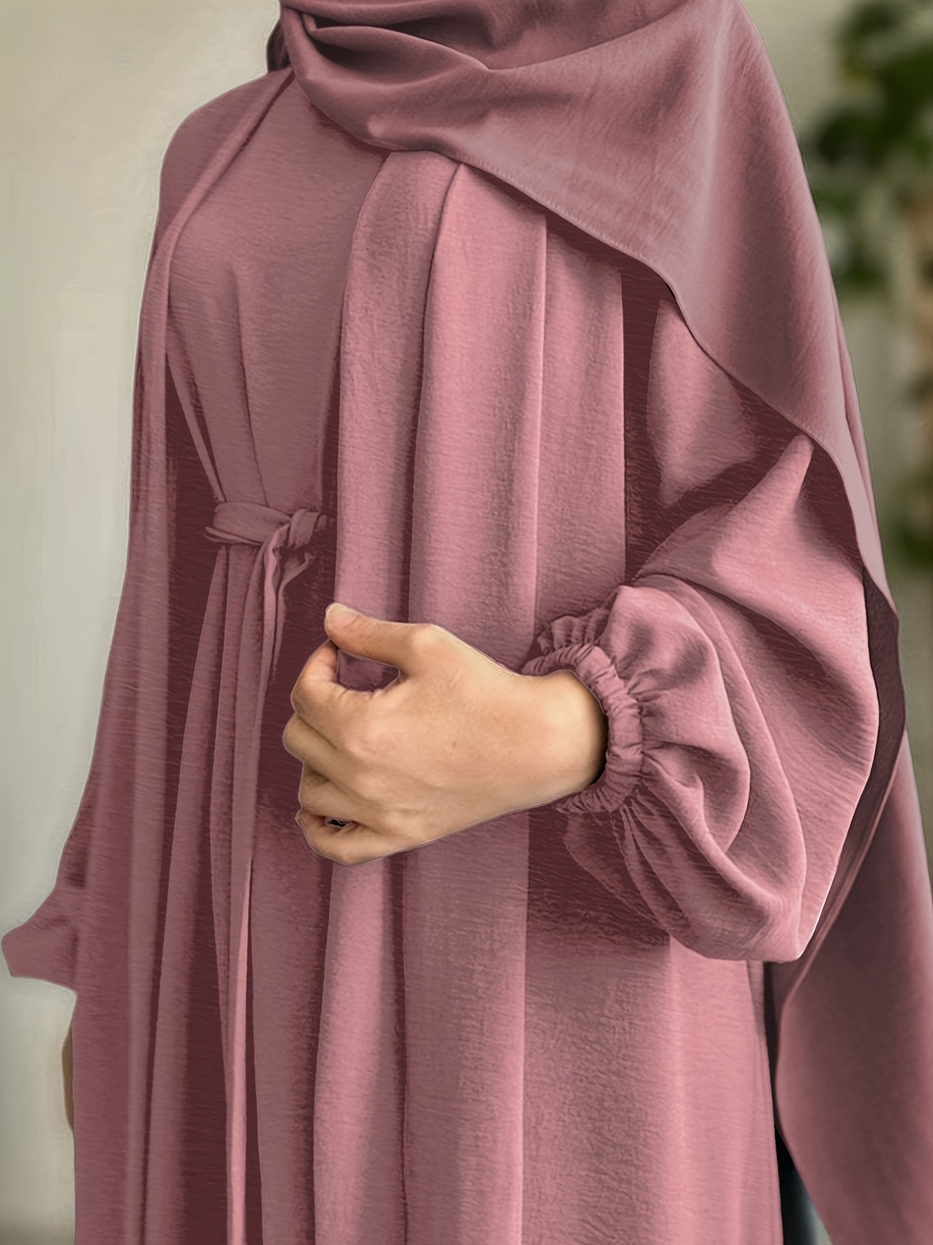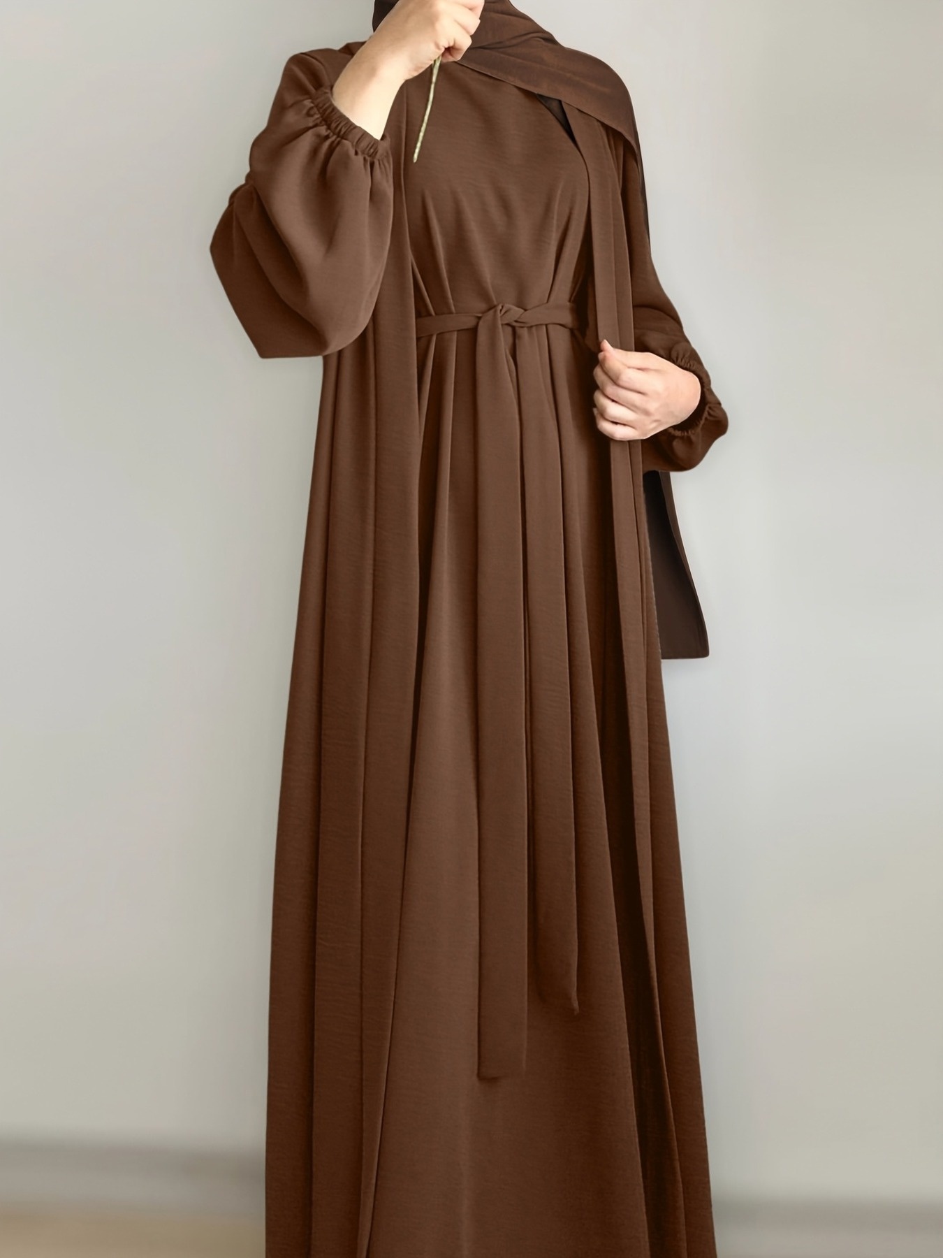 3pcs Traditional Middle Eastern Abaya Dress Set - Long Sleeve, Belted Waist, Solid Color, Non-Stretch Fabric, Spring/Summer/Fall Wear, Includes Cardigan, Dress, and Headscarf, Cultural Attire|Traditional Attire|Belted Waist Dress