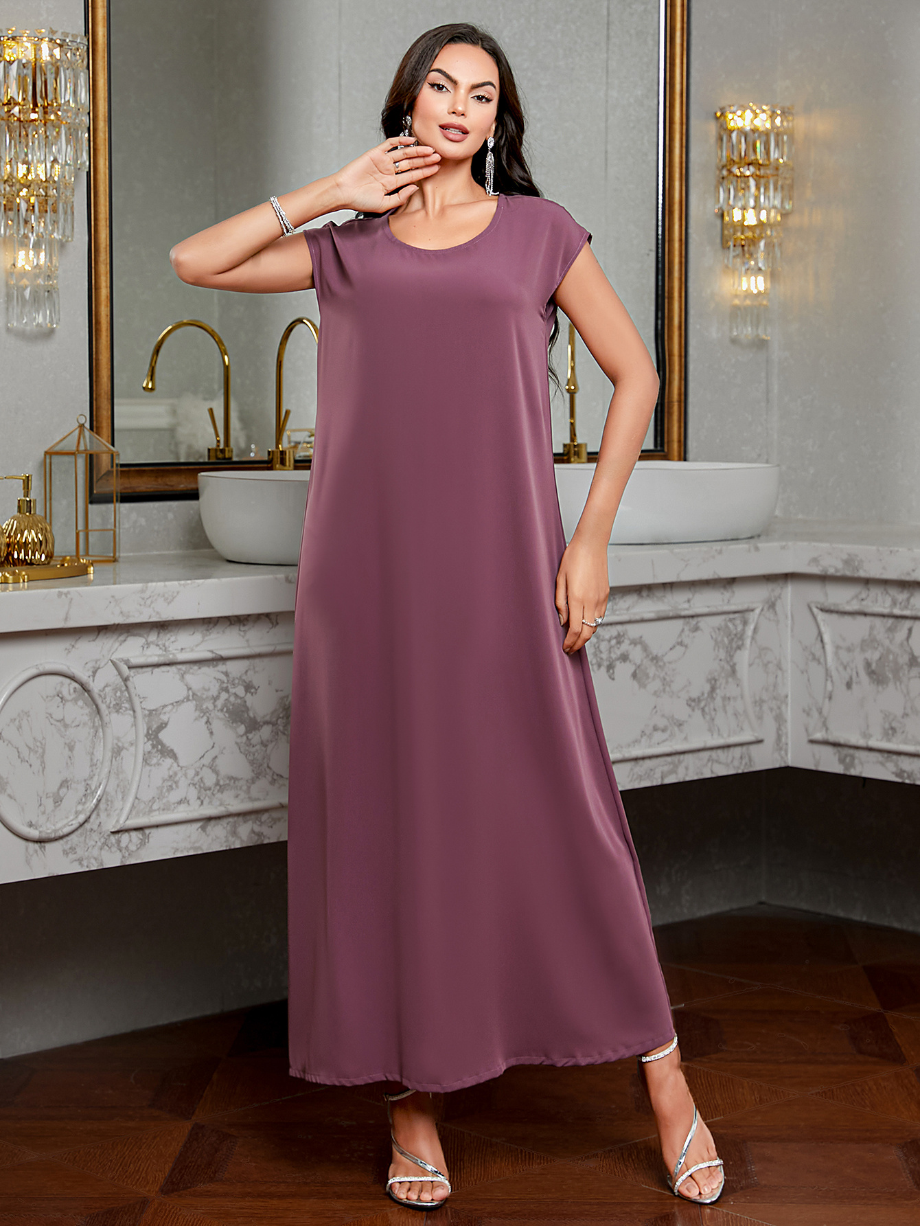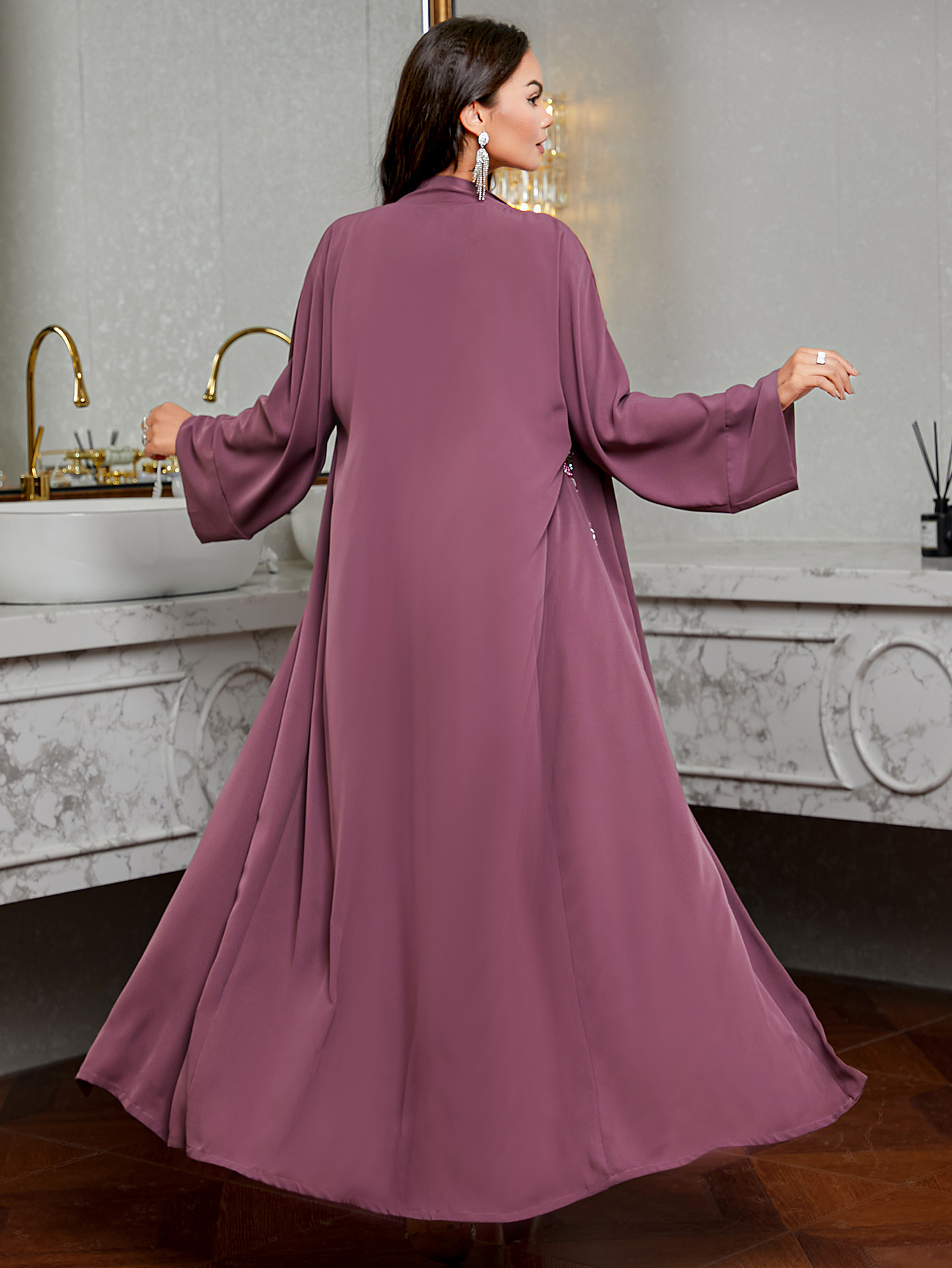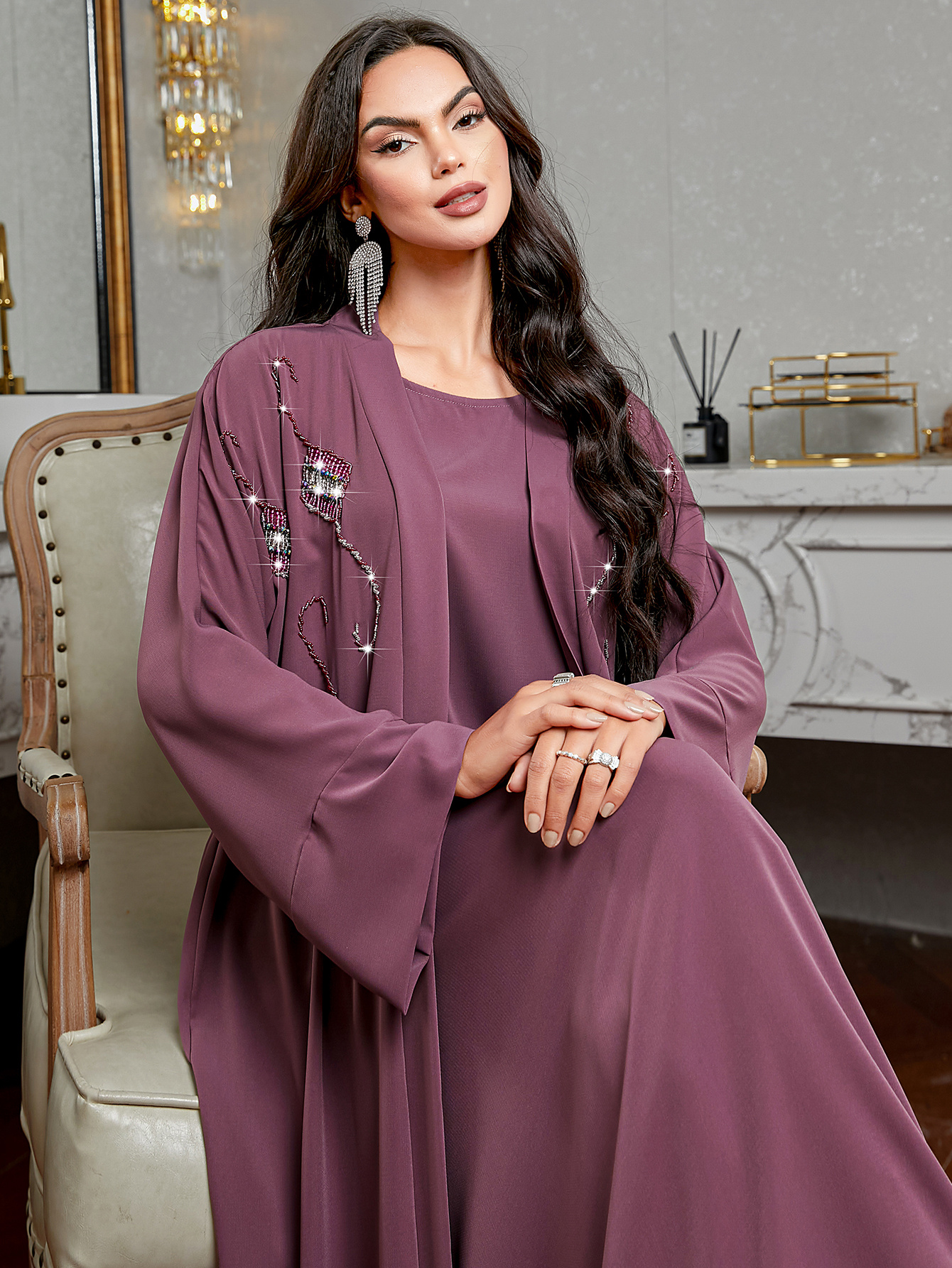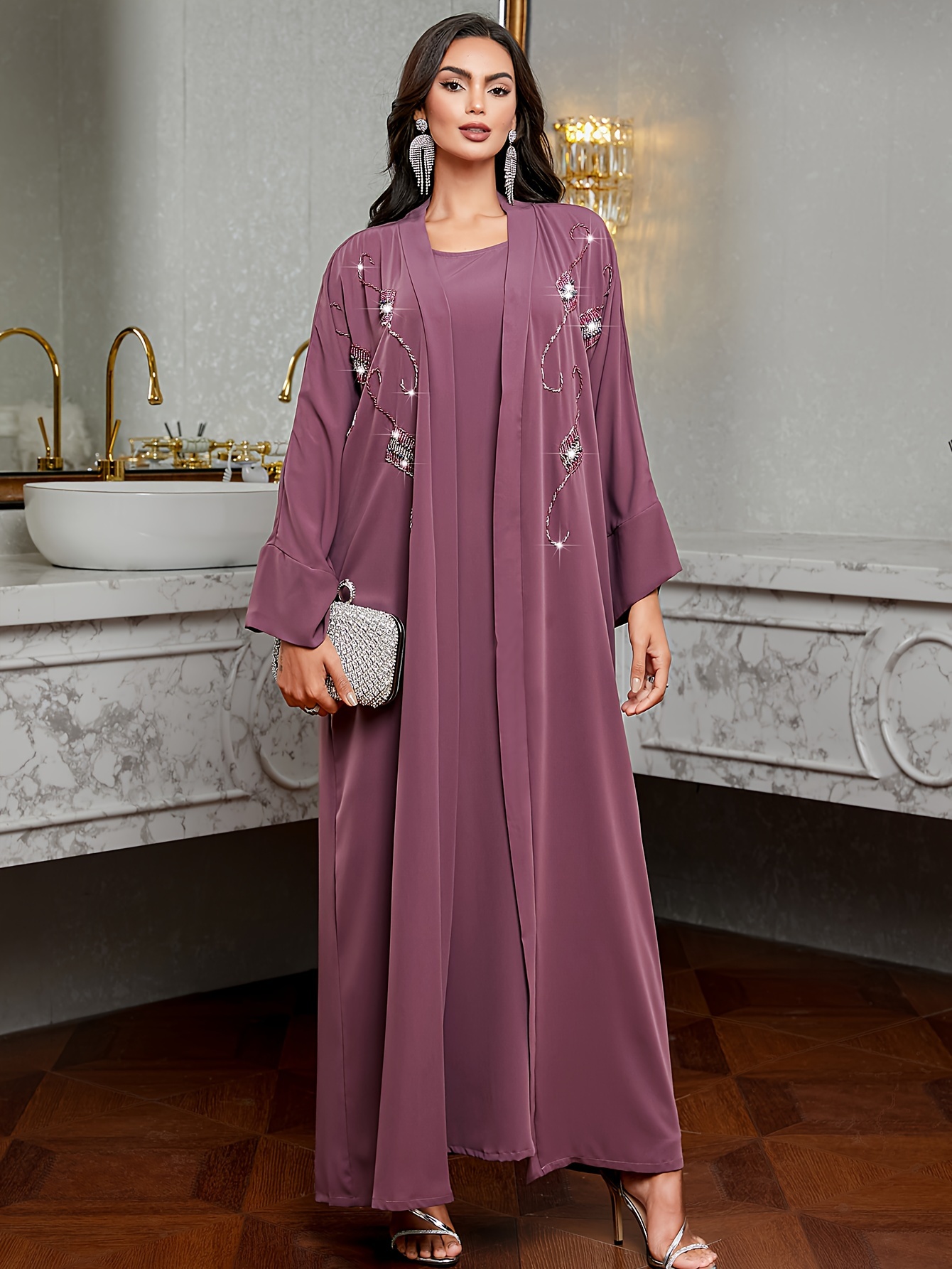[Handmade Beaded Abaya Set] 3136 Handmade Beaded Abaya Set for Women - Lavender Long Tunic with Golden Accents, Includes Camisole and Outerwear, Perfect for Spring/Summer, Casual Elegant Wear, Elegant Attire | Beaded Embellishments | Nonstretch Fabric