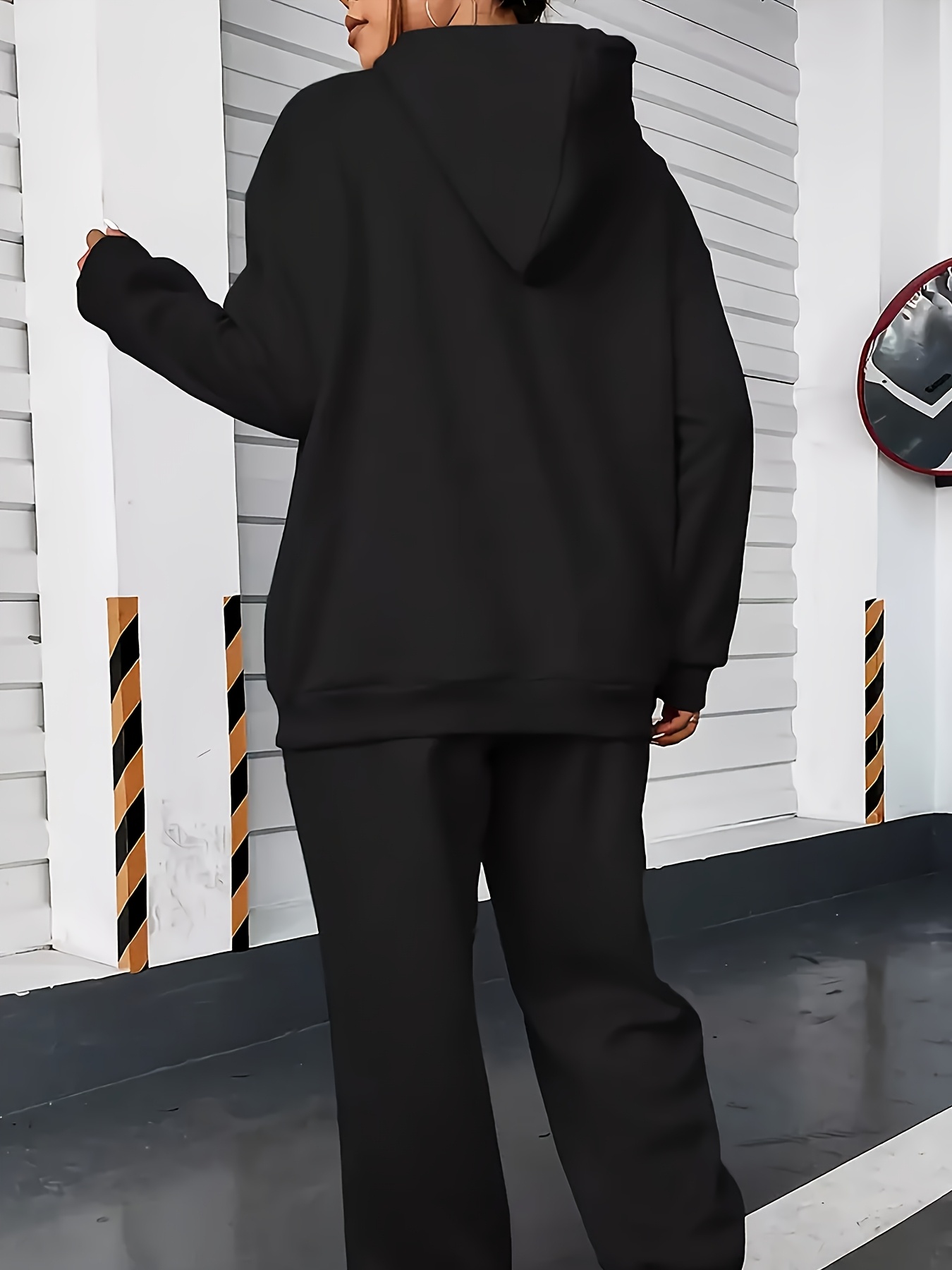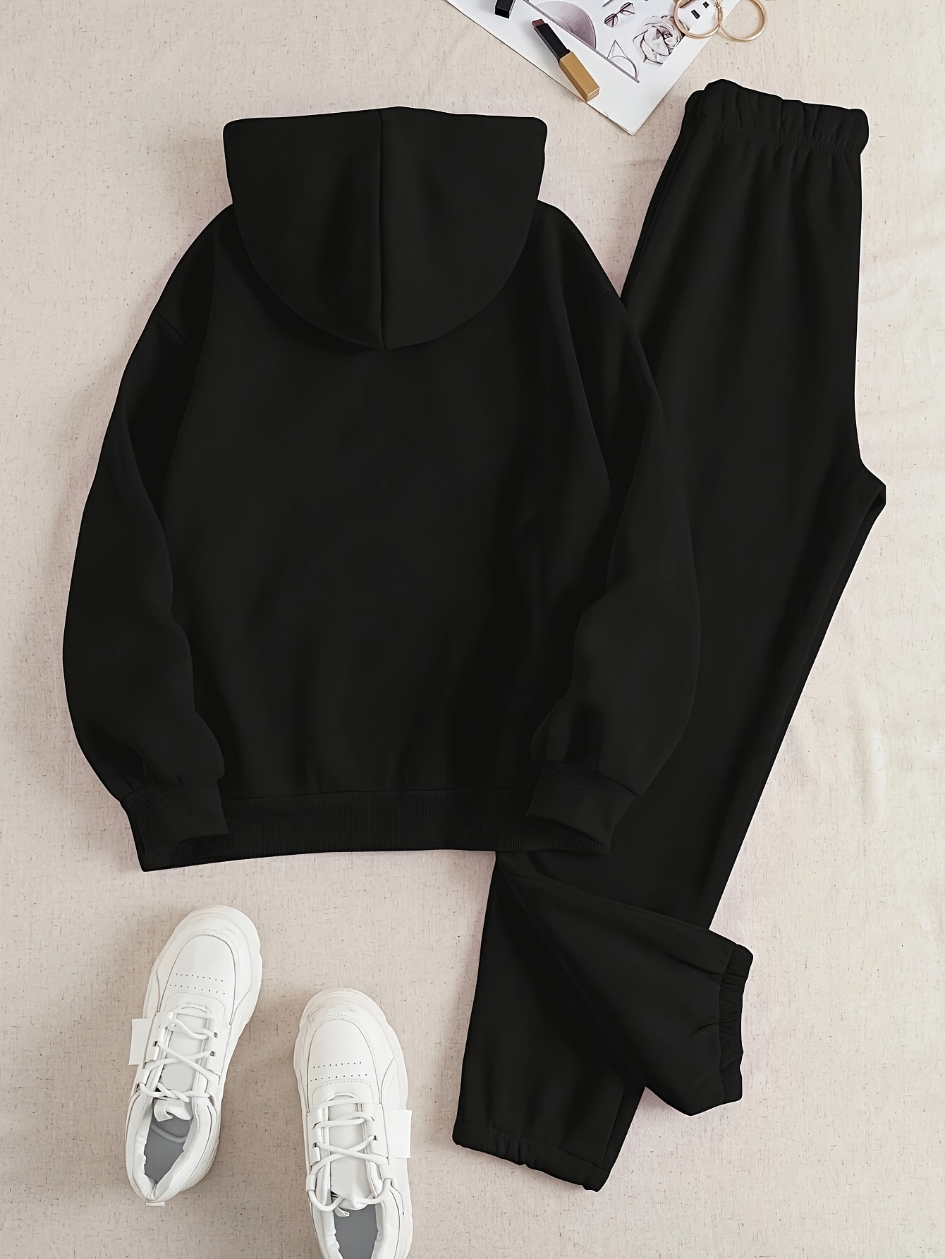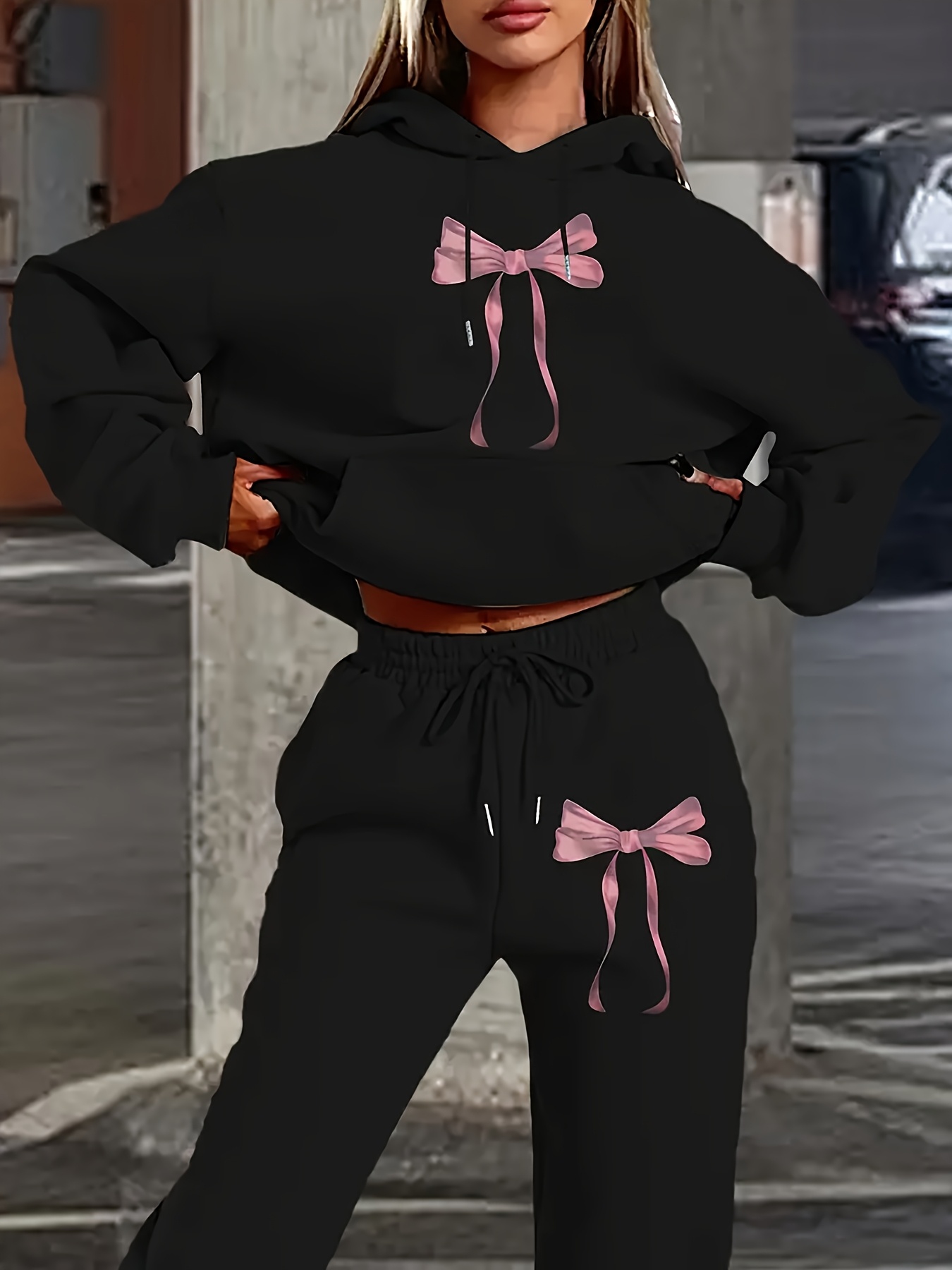 [Women's Hooded Tracksuit Set] Elegant Women's Hooded Tracksuit Set, Polyester Knit Fabric, Alphabet Pattern, Comfortable Loungewear, with Pink Bow Detail, for Fall/Winter