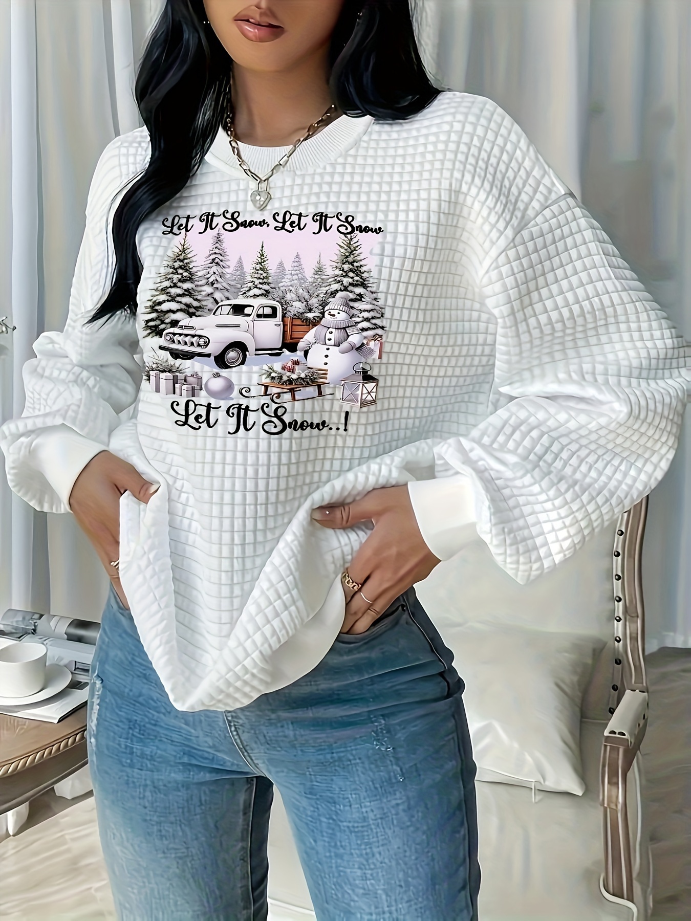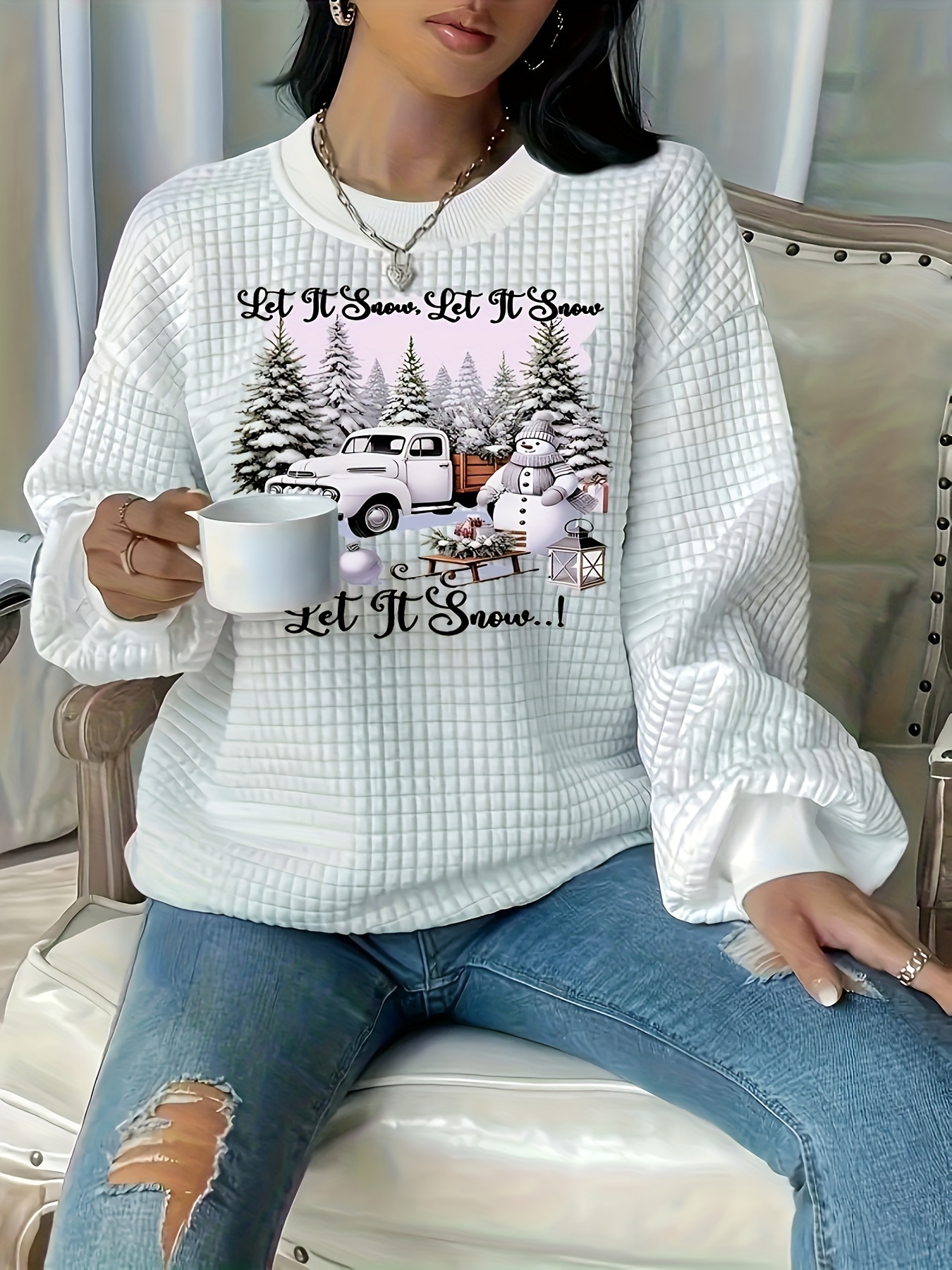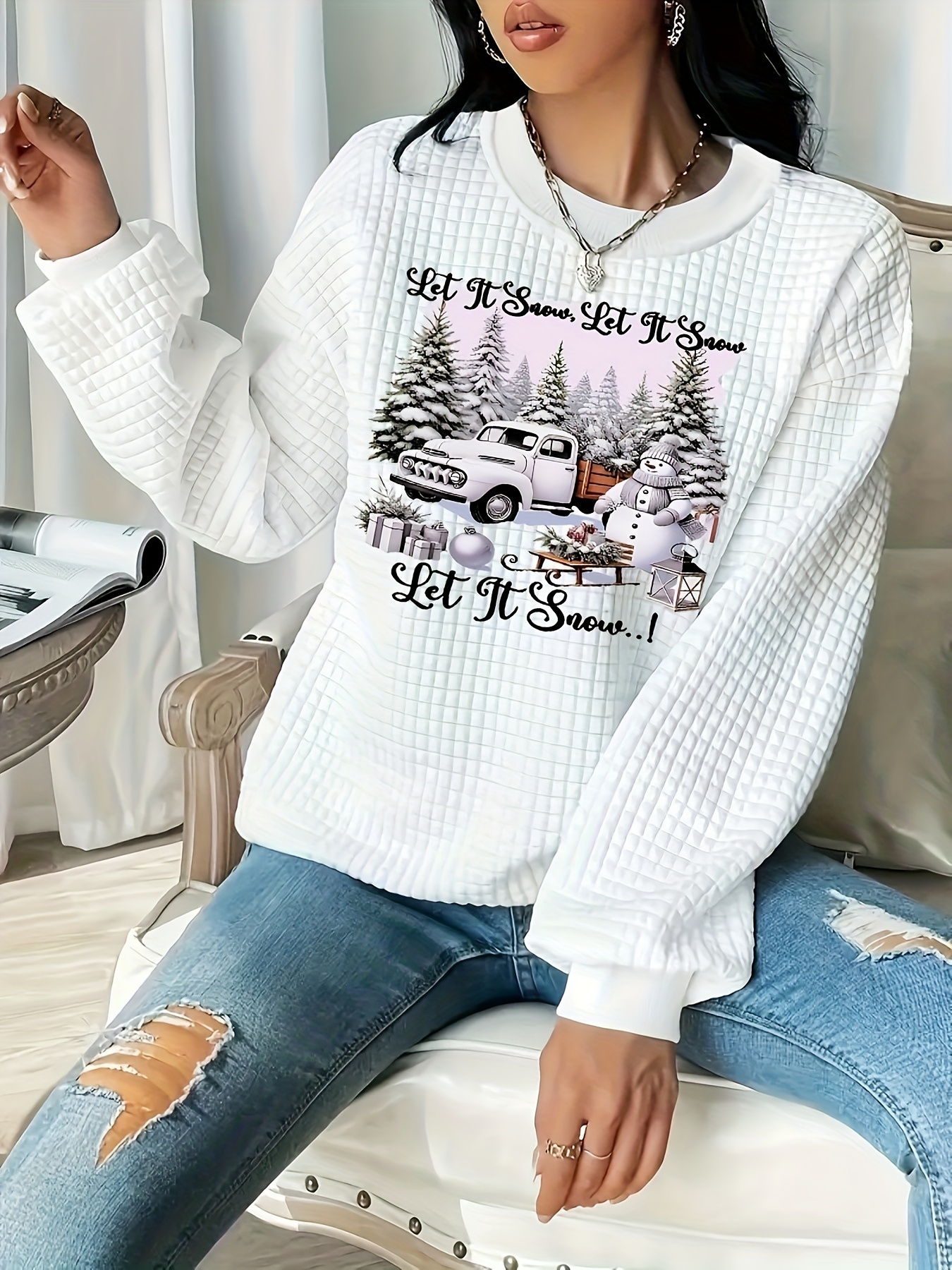Christmas Trucks Letter Print Sweatshirt for Women - Casual Waffle Knit Long Sleeve Pullover - Soft, Breathable, Comfortable Fall/Winter Design - Merry Christmas Casual Wear