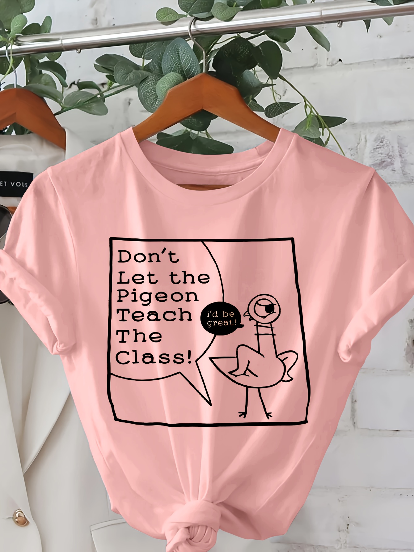 Don't let pigeons teach Graphic Print T-shirt, Short Sleeve Crew Neck Casual Top for Summer & Spring, Women's Clothing