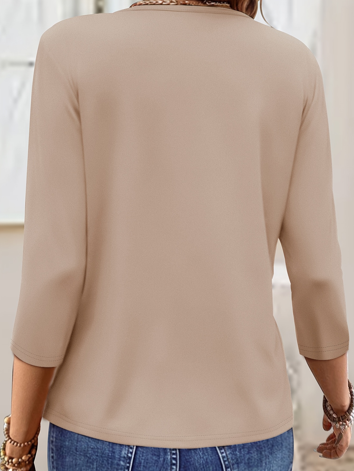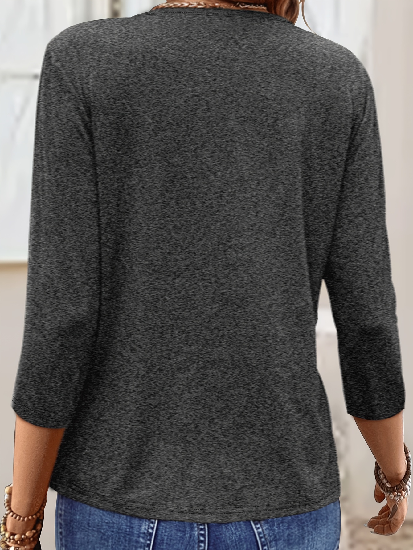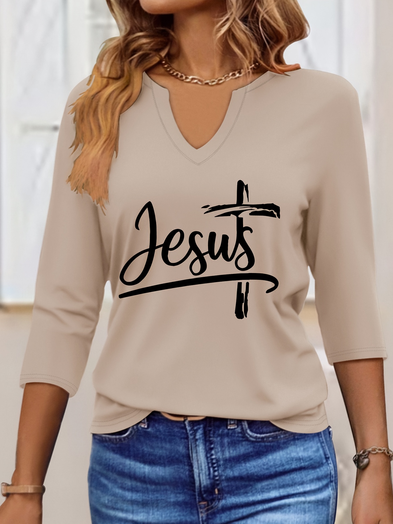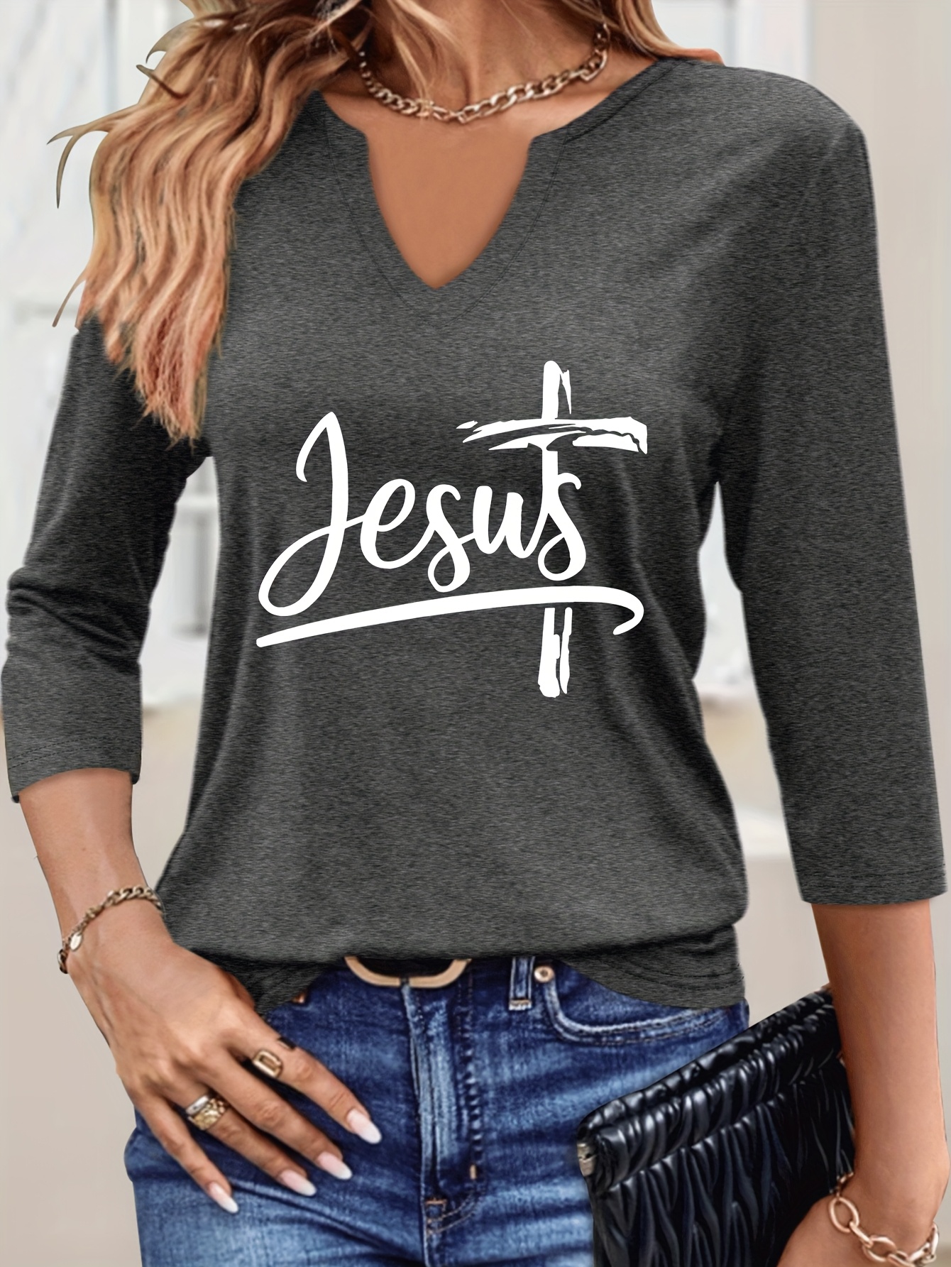 [Jesus Print Casual Top] Comfortable Polyester Women's Casual V-Neck 3/4 Sleeve Top with "Jesus" Letter Print | Spring/Summer Fashion, Regular Length, Applique Detail