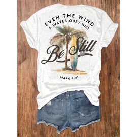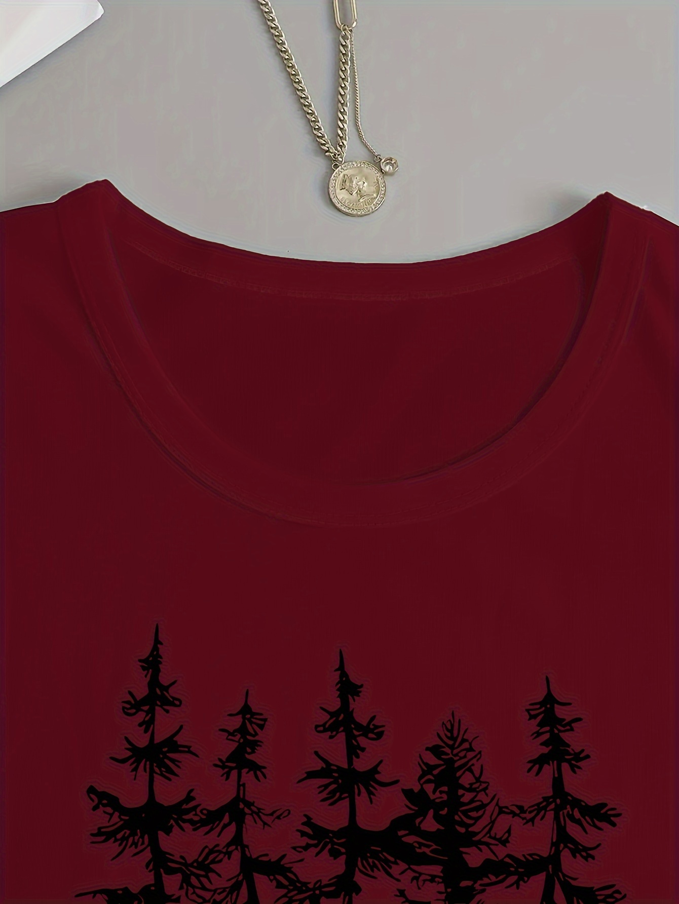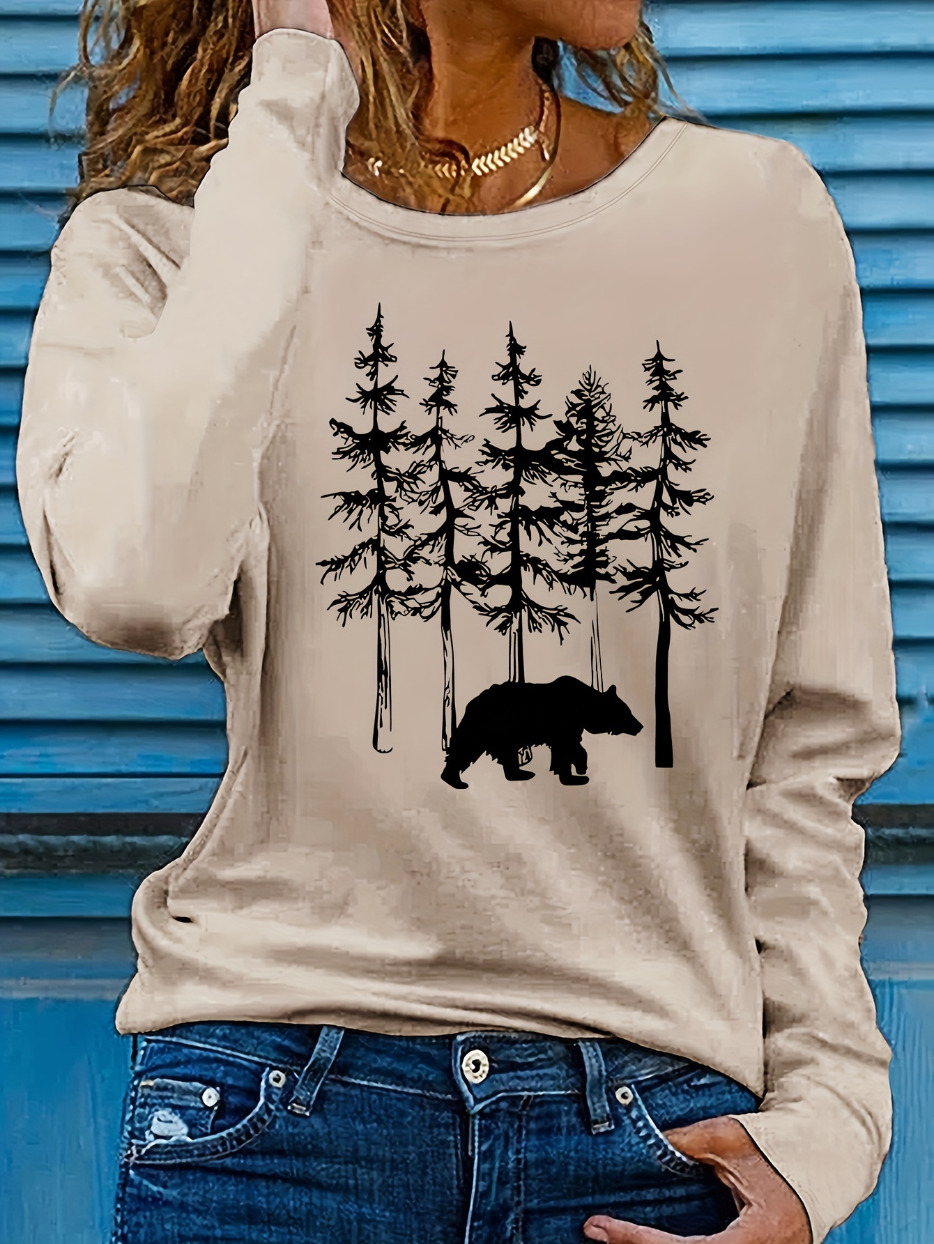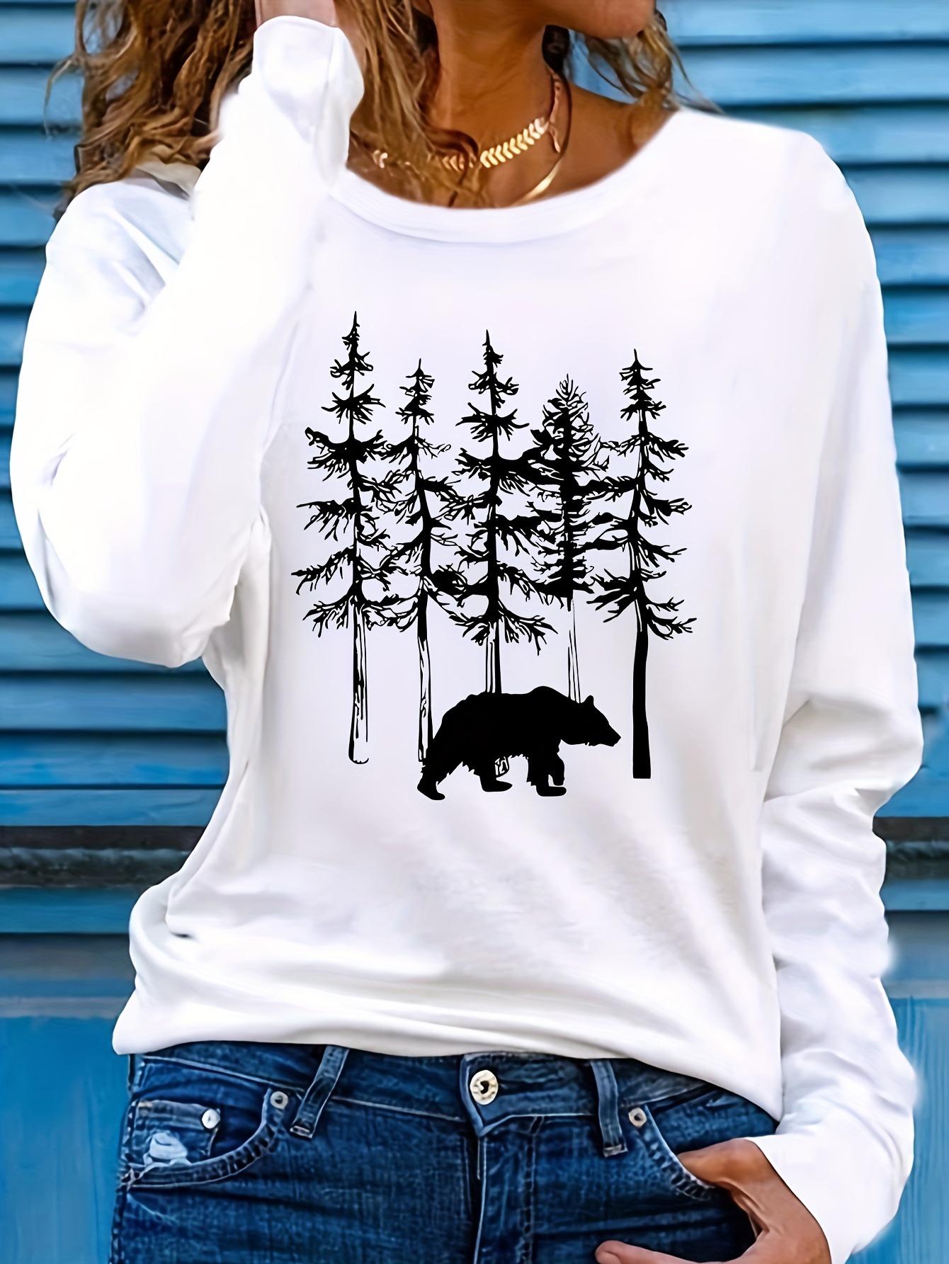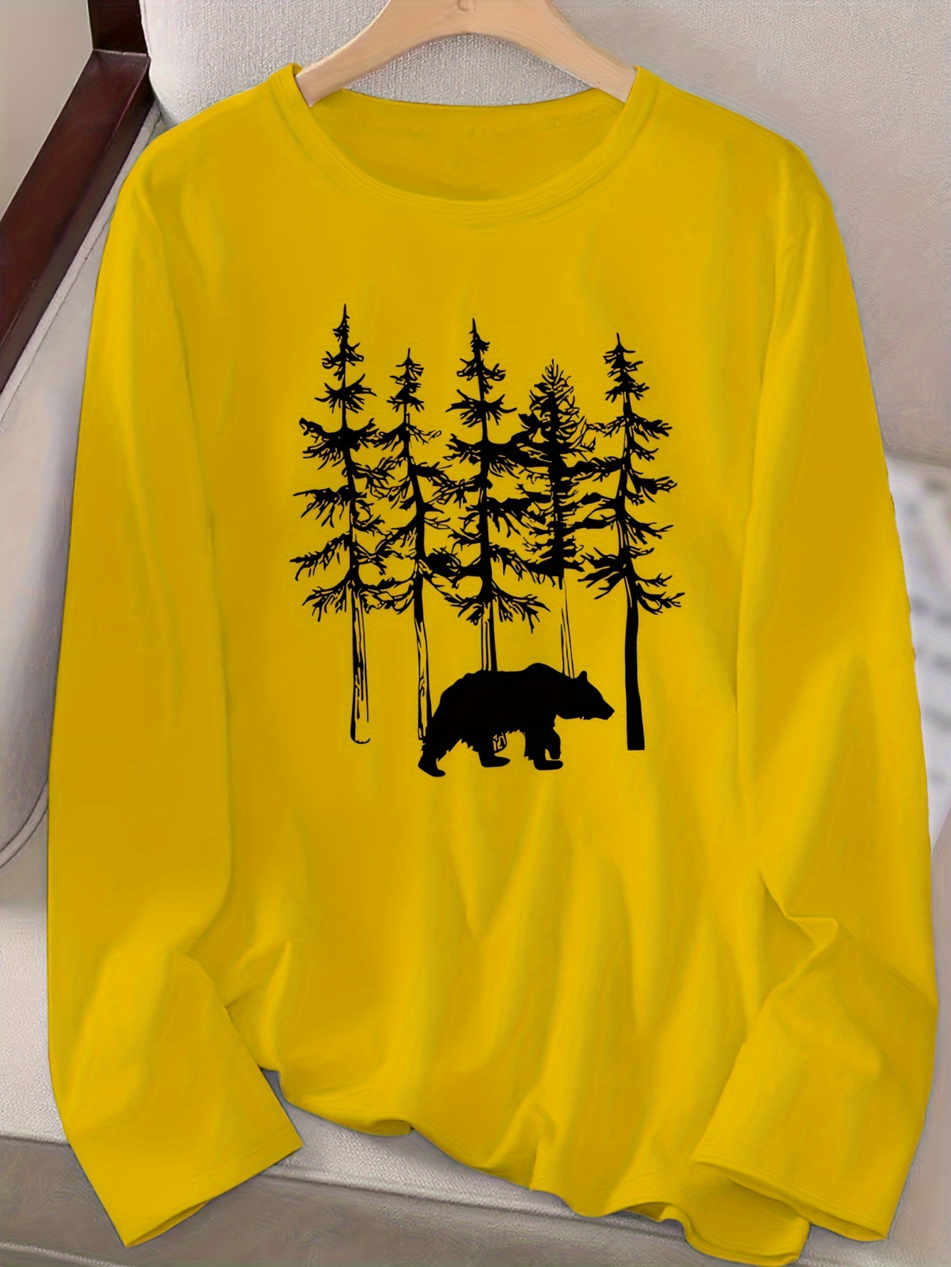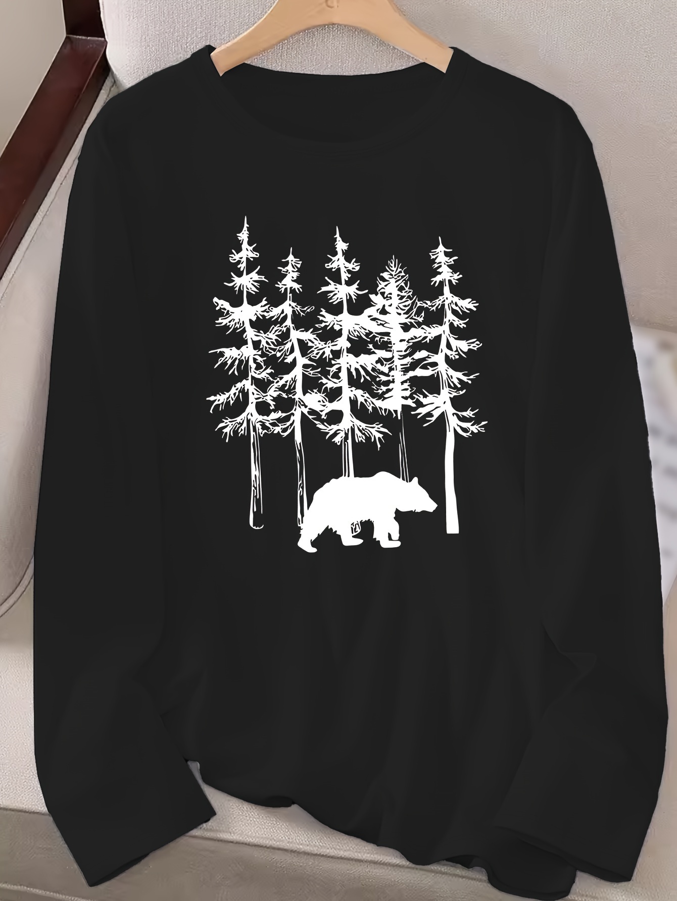 Women's Casual Long Sleeve Crew Neck T-Shirt - Forest Graphic Print with Pine Trees & Bear Silhouette, Medium Stretch Machine-Washable Top for Spring/Fall, Regular Fit Nature-Inspired Casual Attire, Allseason Apparel, Mediumelastic Fabric