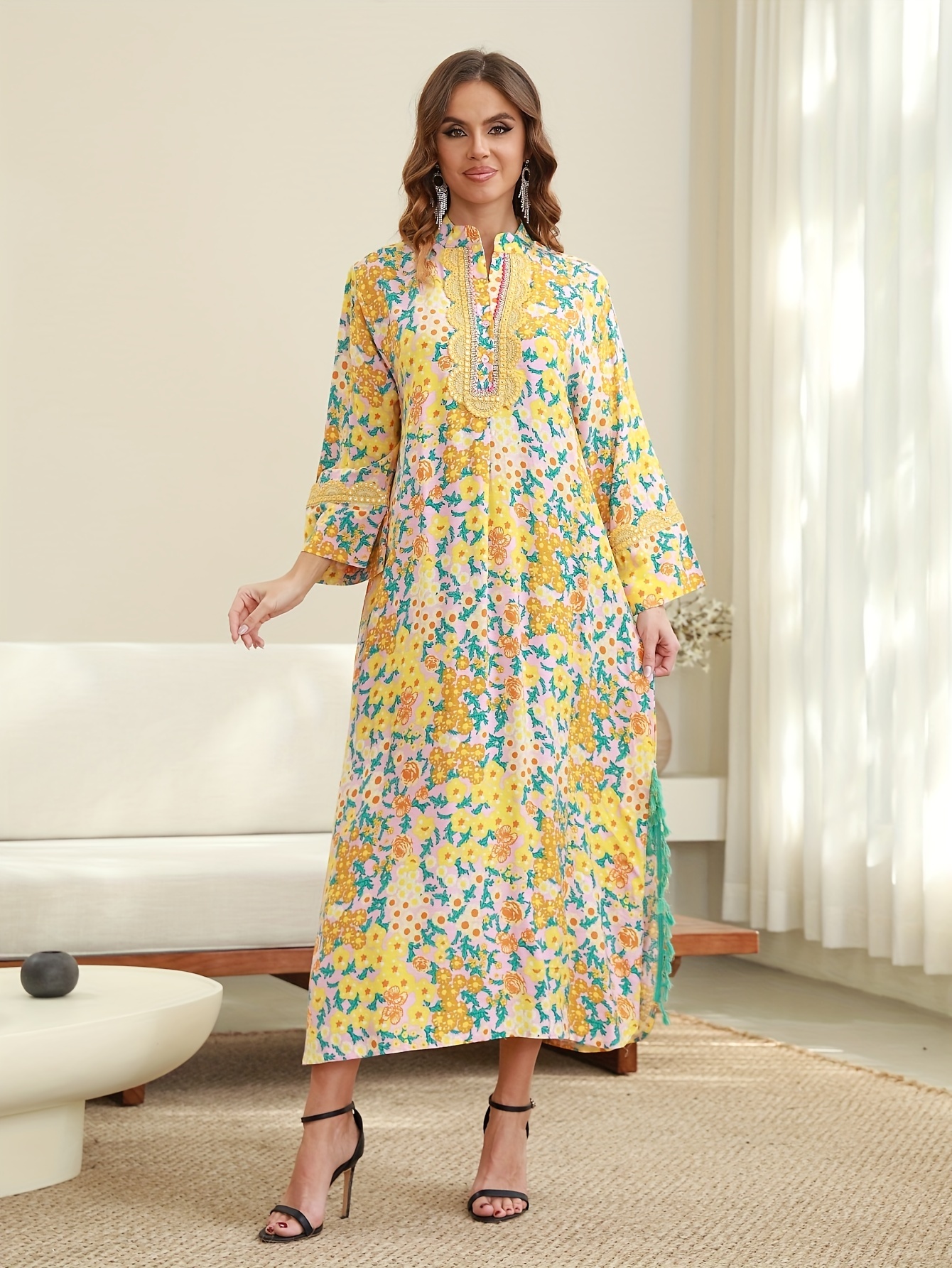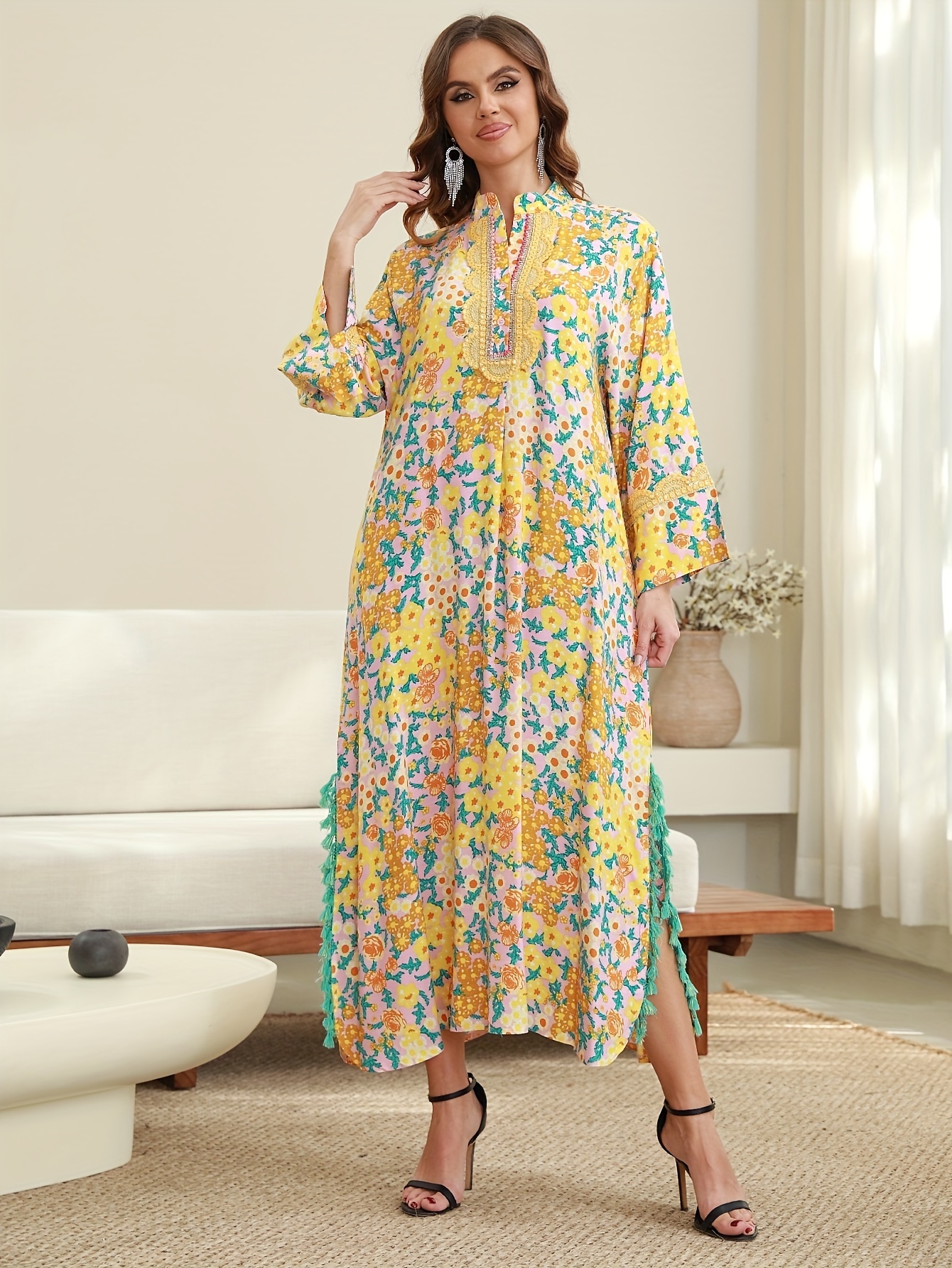 Elegant Floral Print Abaya with Golden Accents - Long Sleeve, Mid-Length, Loose Fit, Slit Hem, Embroidered Detail, Perfect for Saudi National Day, All-Season Wear, Cultural Attire|Floral Print Abaya|Embroidered Detailing, Abaya Dress