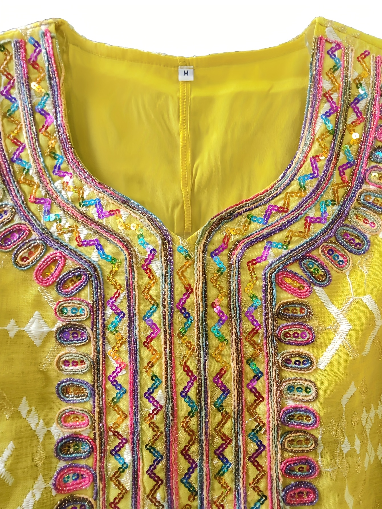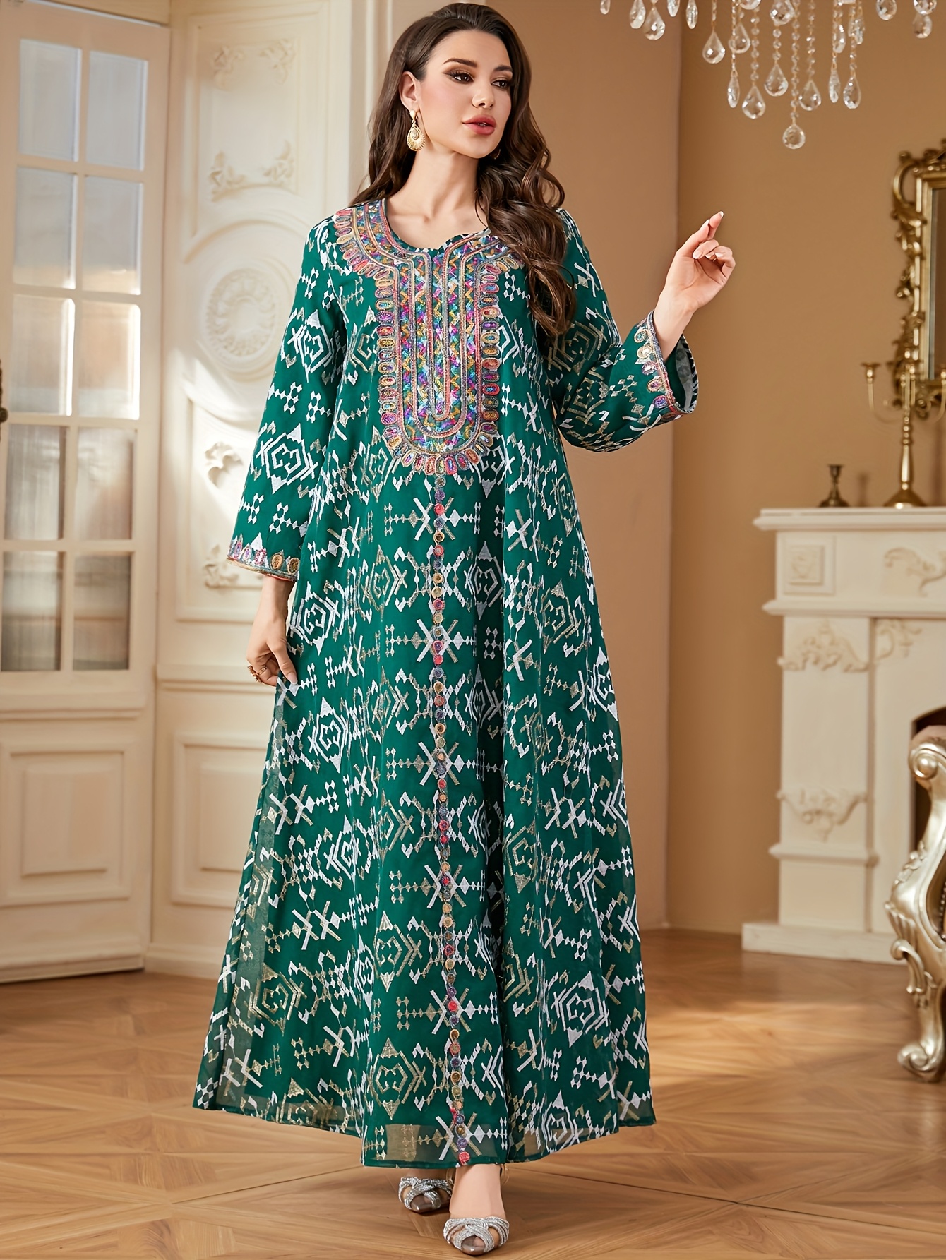 Elegant Floral Sequin Embroidered Long Sleeve Dress - Traditional Middle Eastern Style, Polyester Lined, All-Season Wear