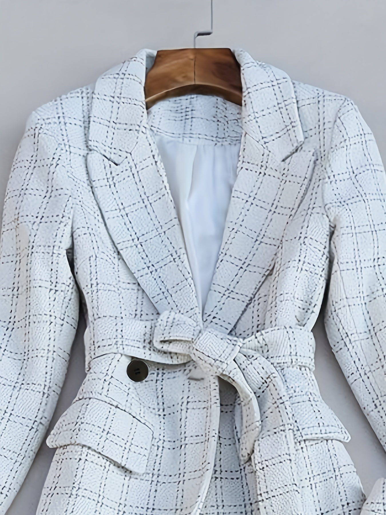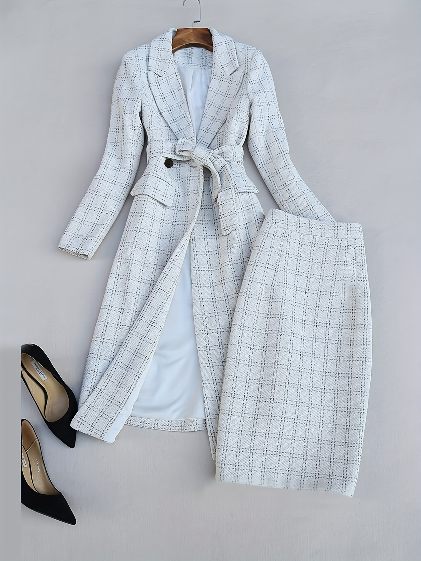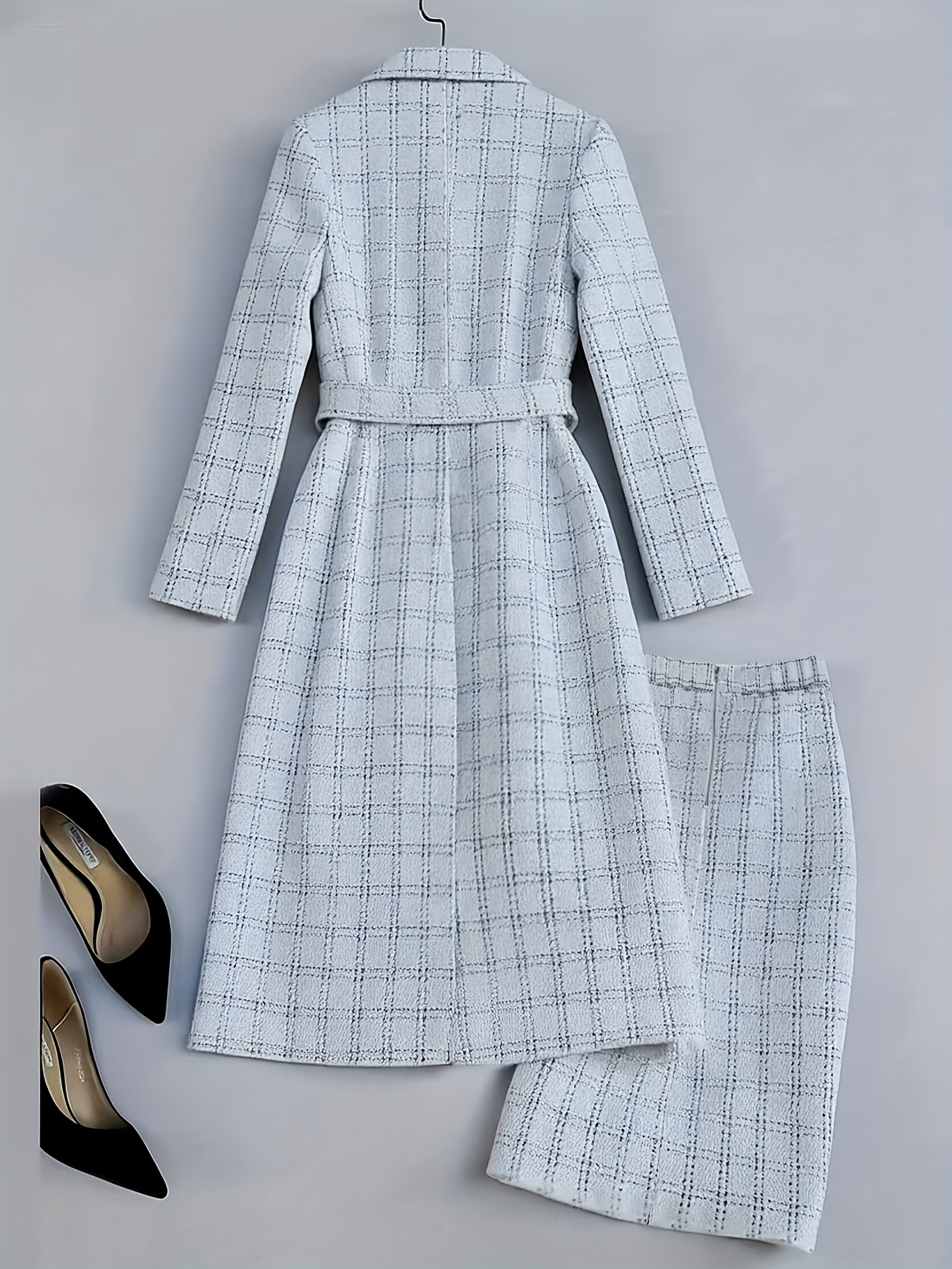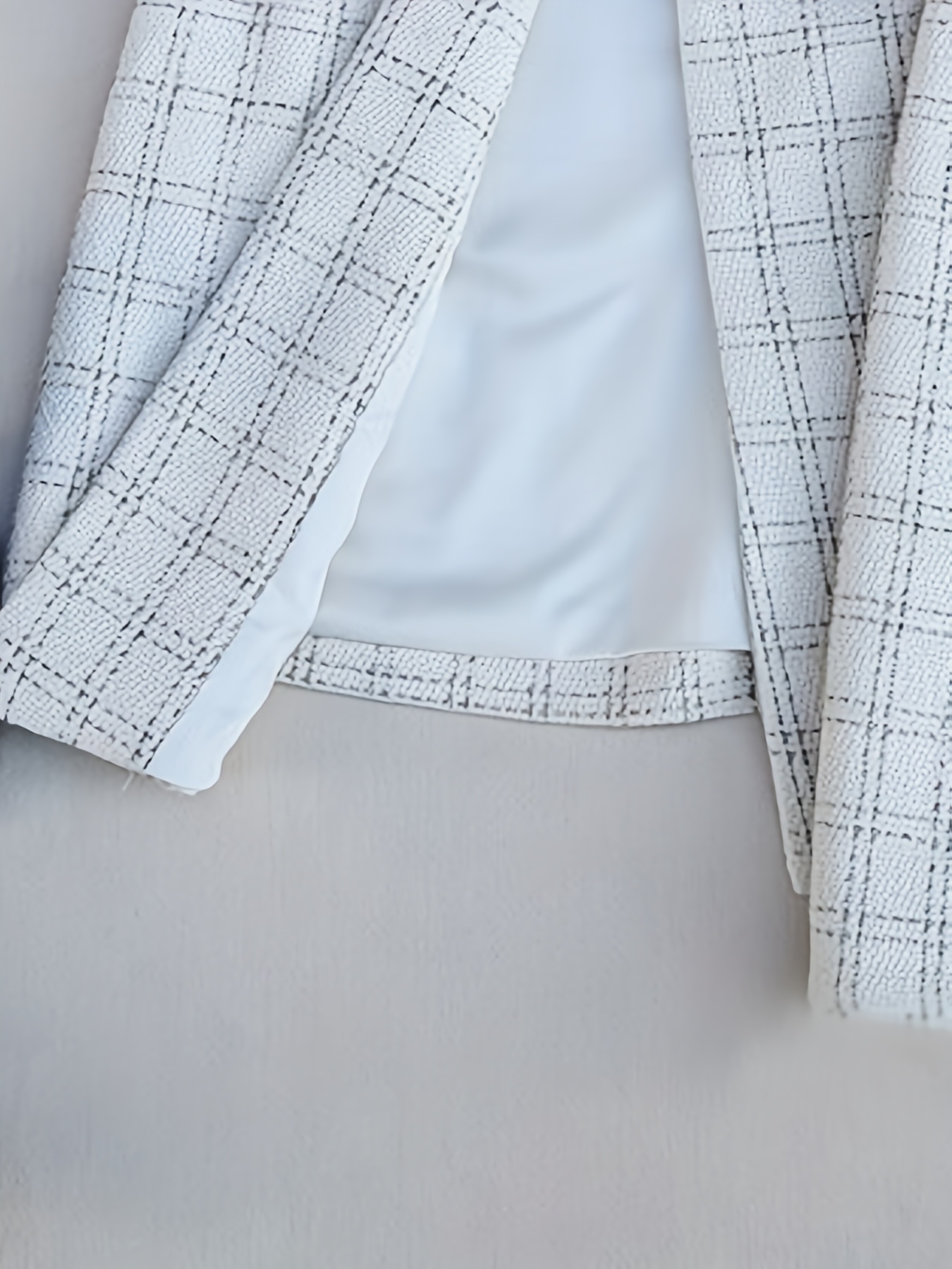 [Chic Plaid Suit] Long Sleeve Plaid Midi Suit Jacket and Skirt Set, Chic Women's Halter Dress Outfit