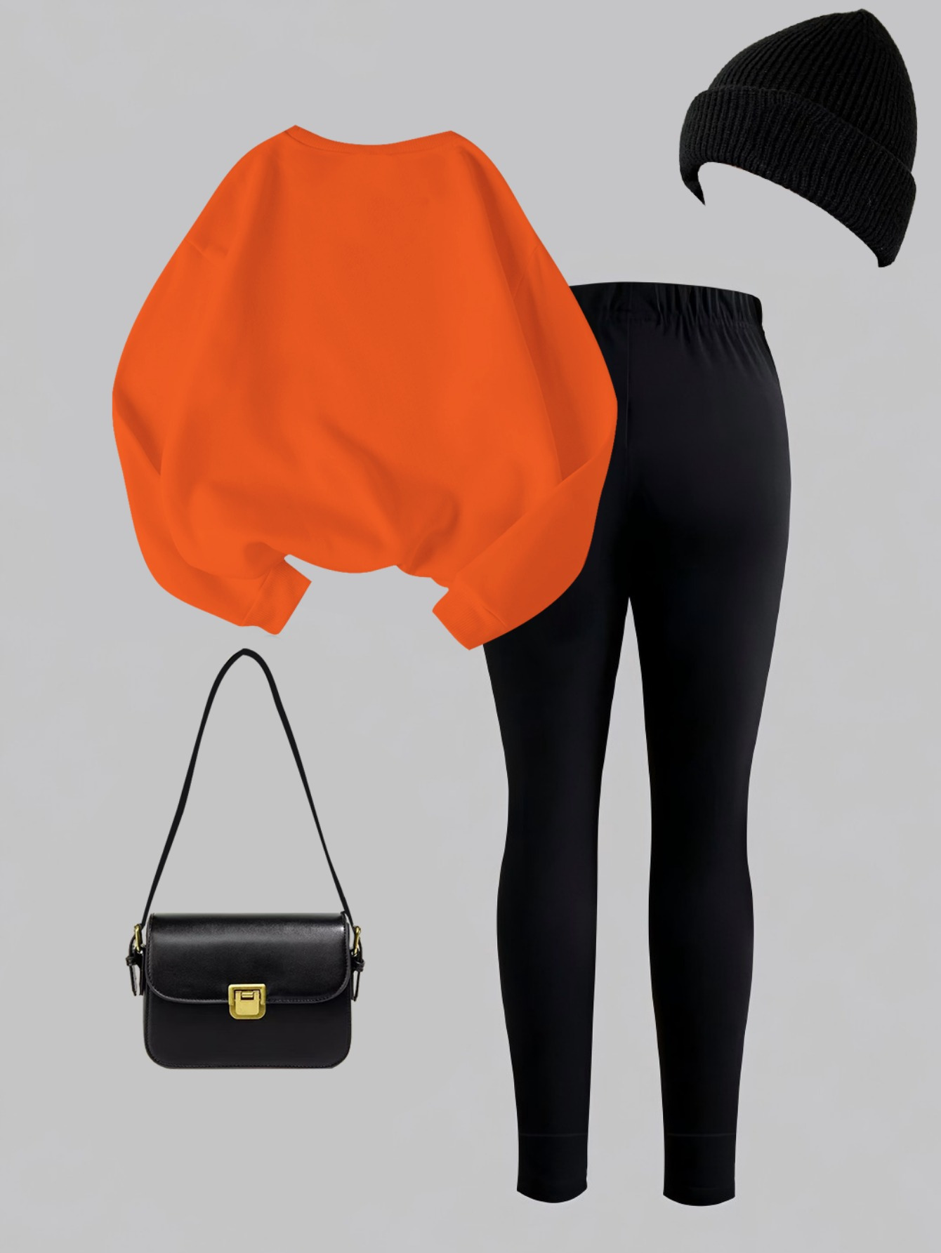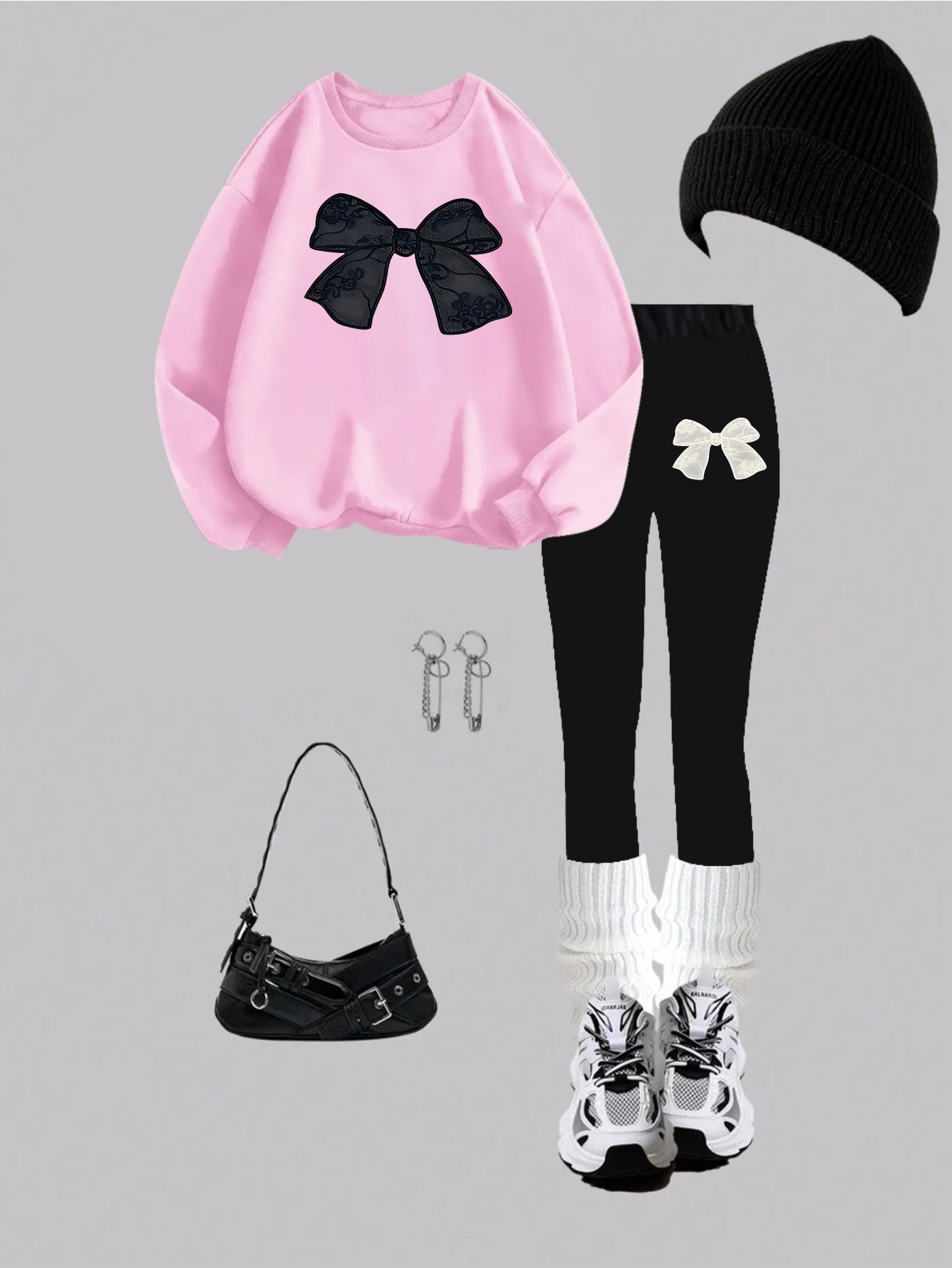Women'S 2pcs Set, Women'S Casual Bow Print Design Crew Neck Sweatshirt and Leggings, Fall/ Winter