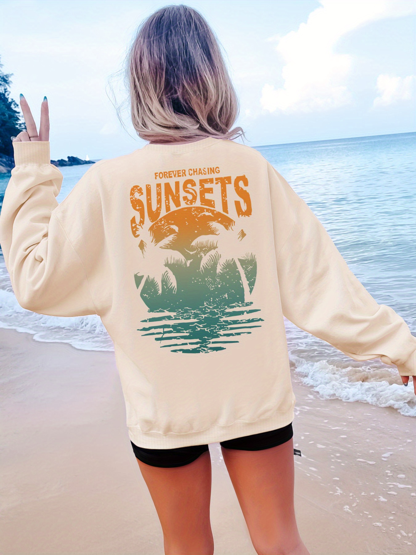 [Palm Tree Print Sweatshirt] Crew Neck Palm Tree Print Sweatshirt - Casual Fall & Spring Women's Clothing