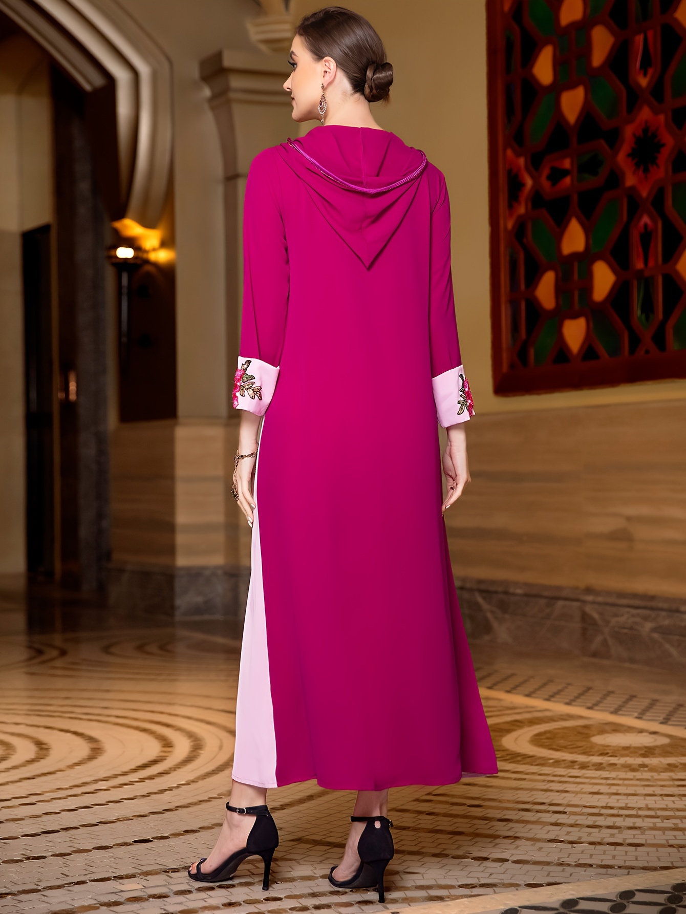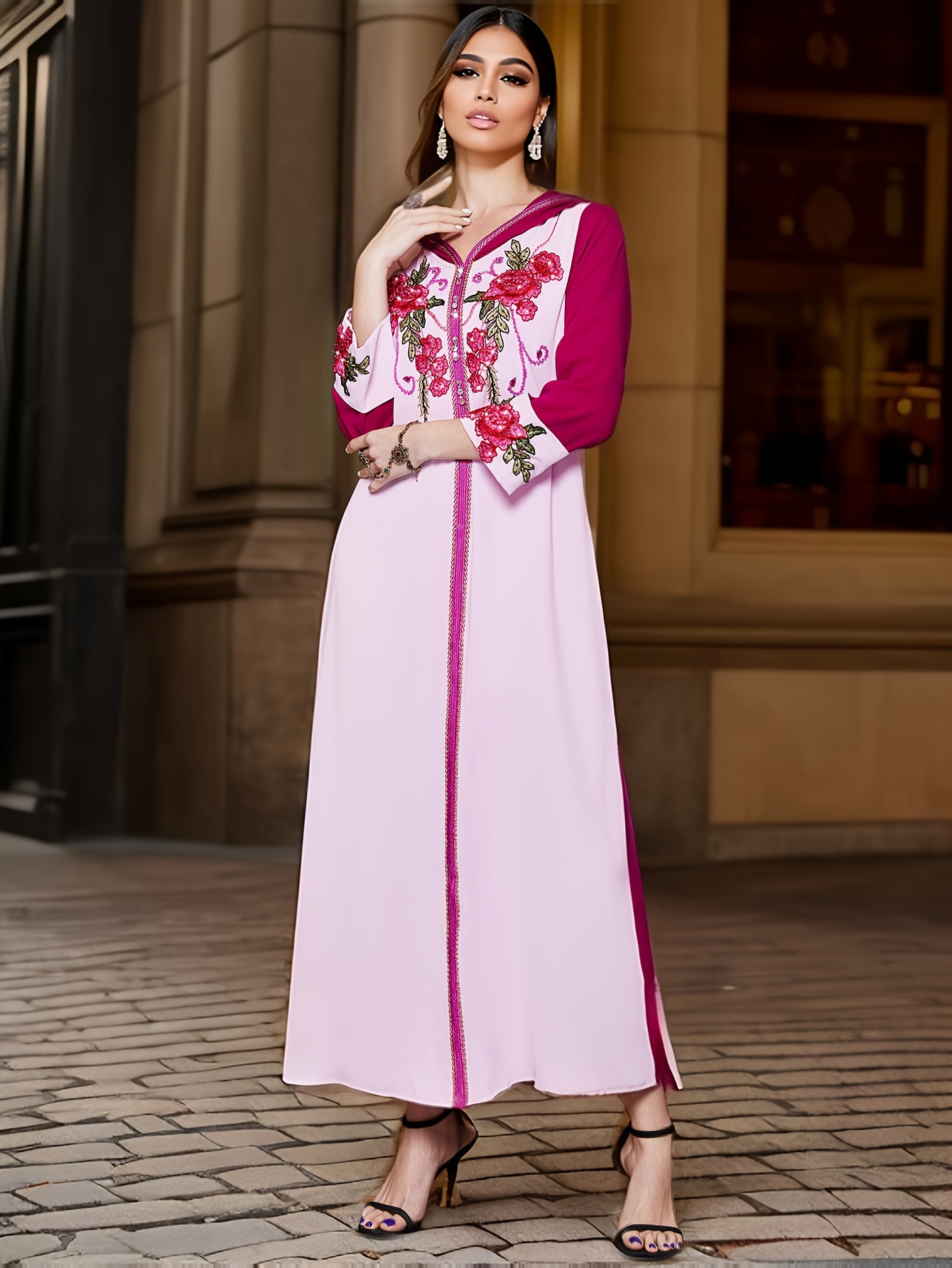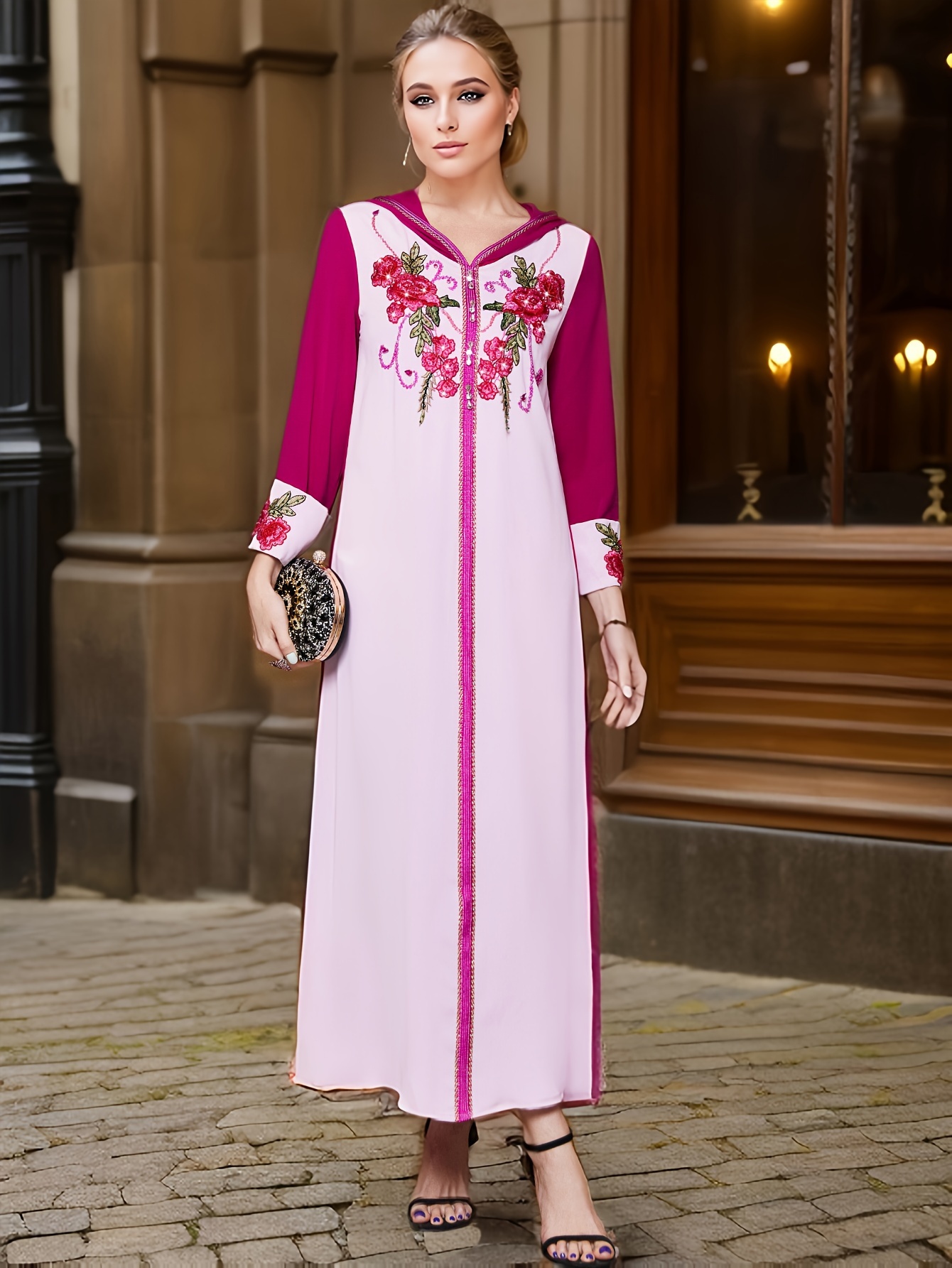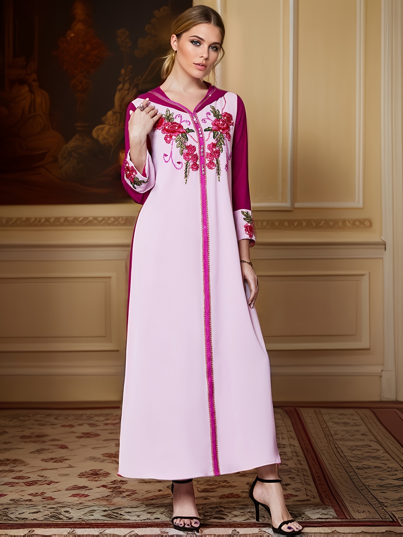 Women'S Elegant Long Sleeve Maxi Dress with Rhinestone Embellishments, Solid Color Polyester 100%, All-Season Woven Fabric, Regular Sleeve, No Belt - Pink & Magenta Floral Pattern