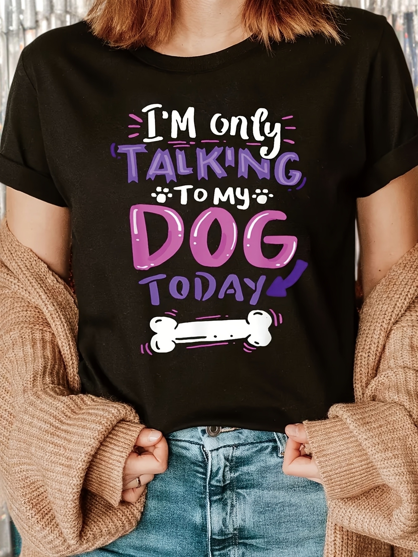 Women's "I'm Only Talking to My Dog Today" Graphic T-Shirt - Casual Short Sleeve Round Neck Top with Paw Prints & Bone Design, Black & Purple Pet Lover Tee, Machine Washable Regular Fit, Dog Tshirt