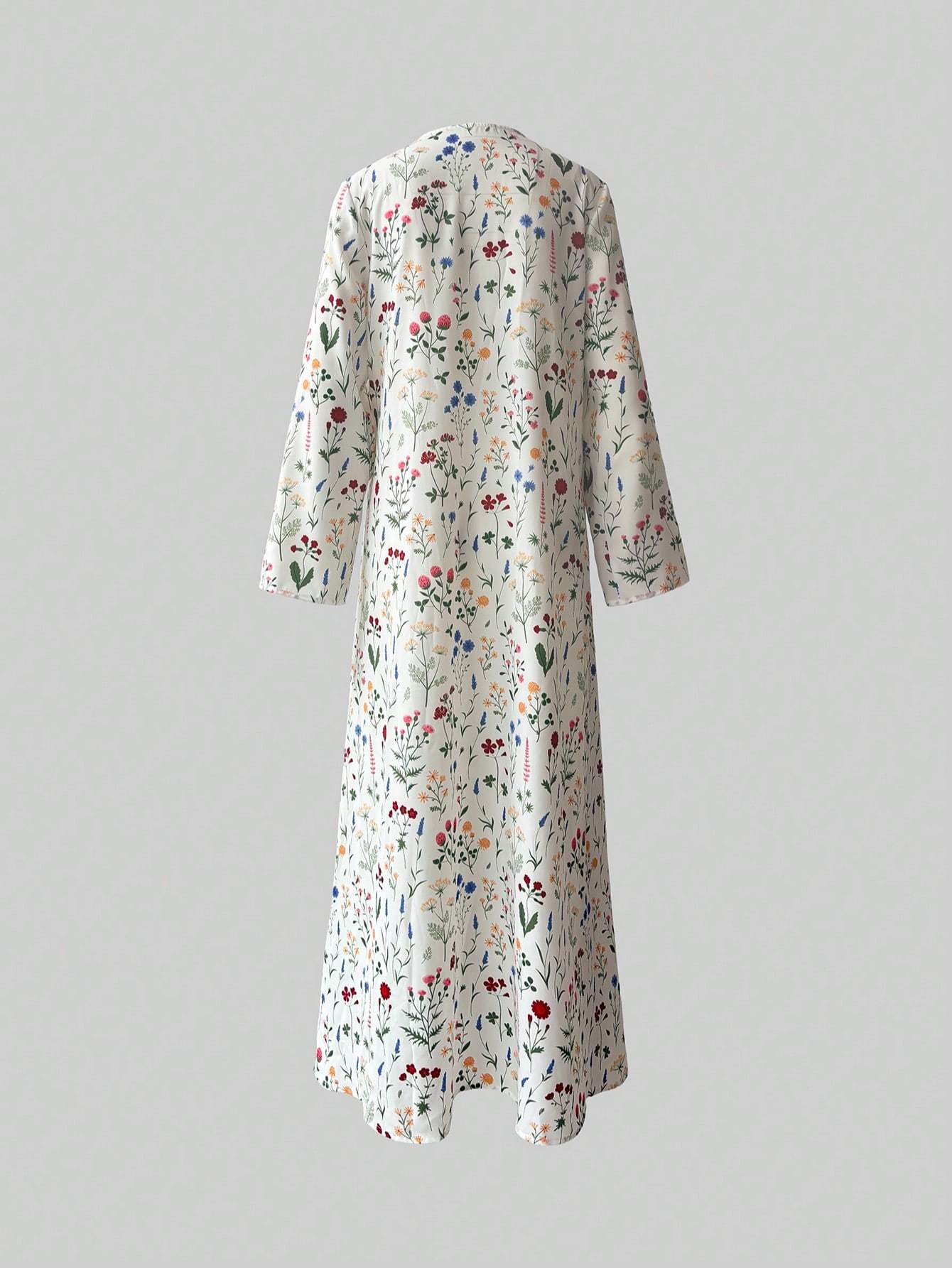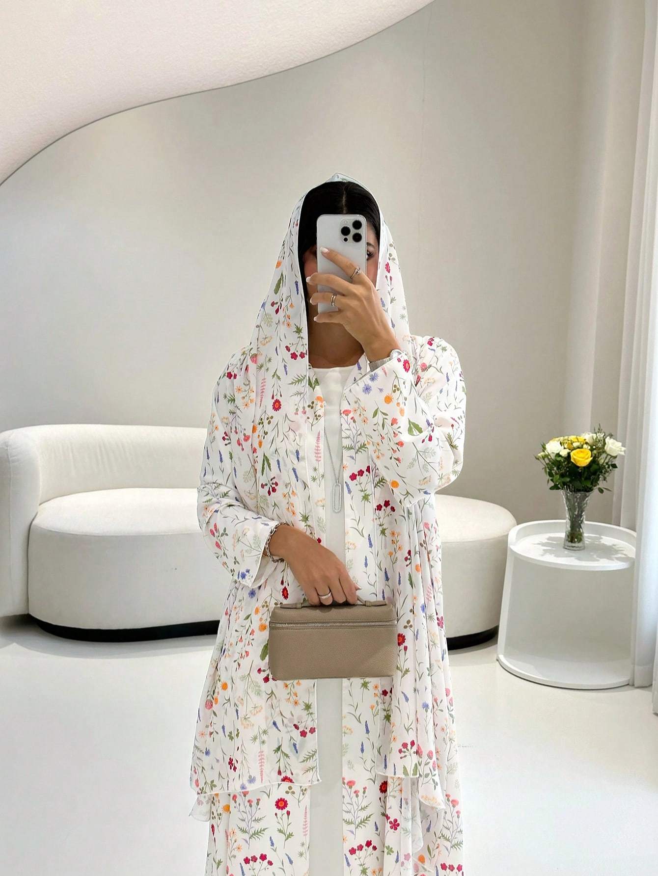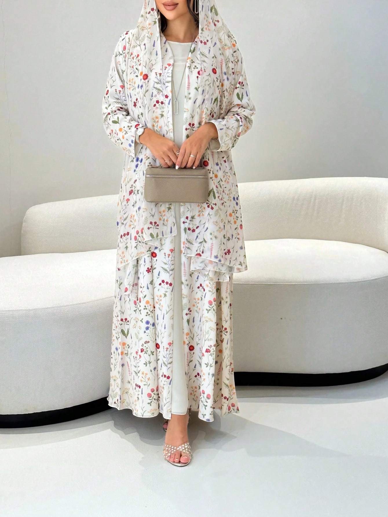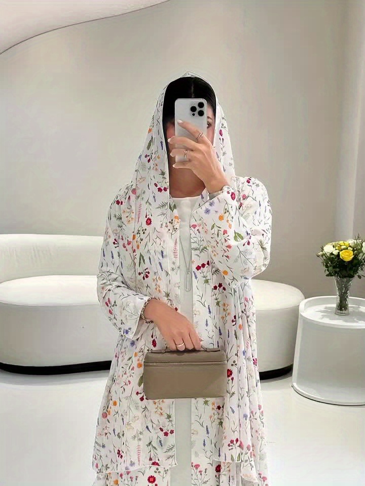 2pcs Elegant Open Abaya & Matching Headscarf Set - Floral Print, Long Sleeve, Loose Fit for Women - Ideal for Spring/Summer Outfits, Versatile Long Abaya|Floral Print Abaya|Traditional Abaya